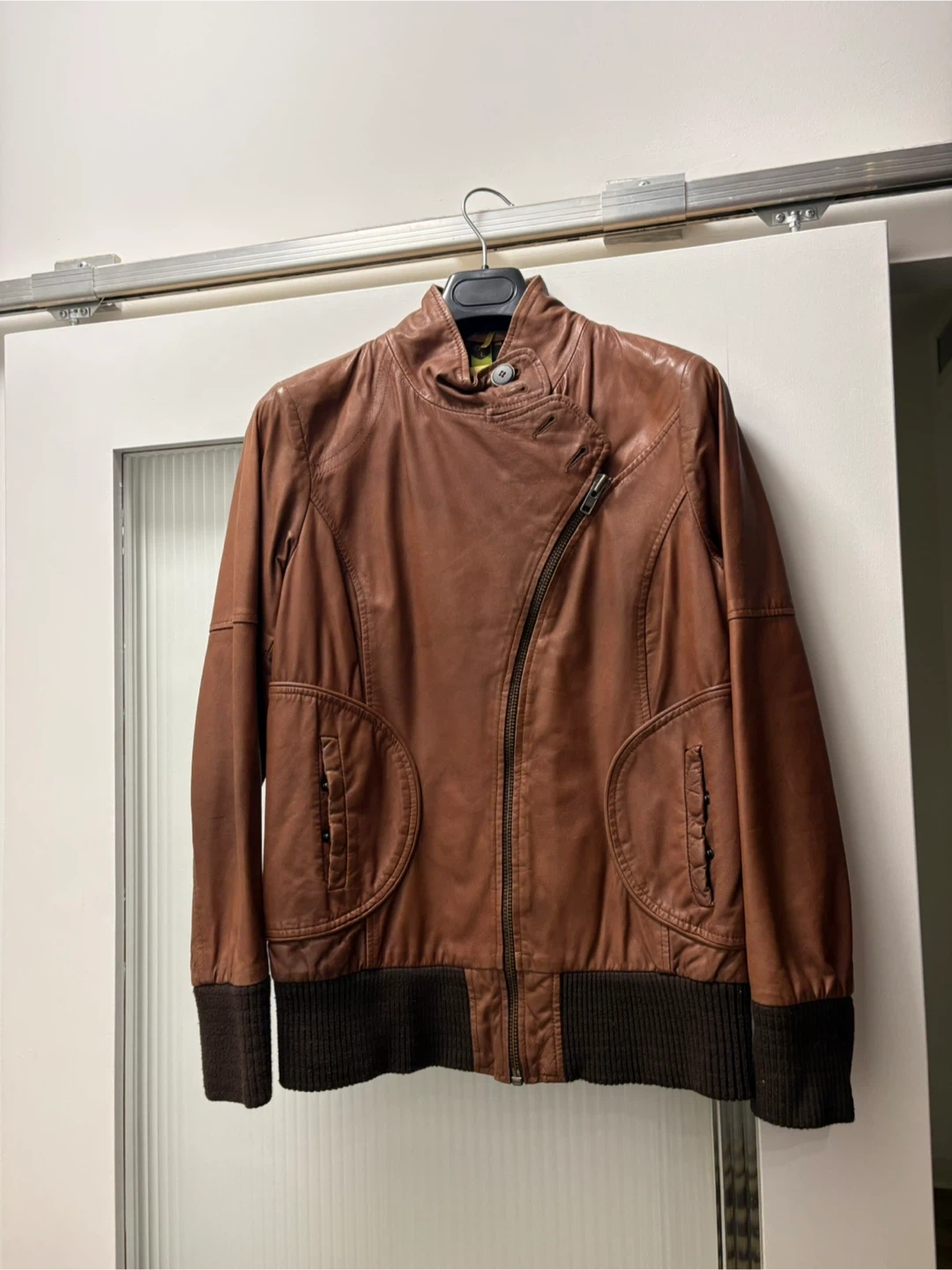 Crafted in a rich cognac brown genuine leather, this piece features a sleek asymmetrical moto design with a structured yet feminine silhouette. The off-centre zip closure, high snap collar, and curved panel construction create a flattering, tailored fit.
