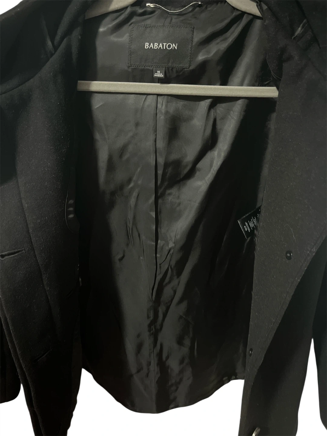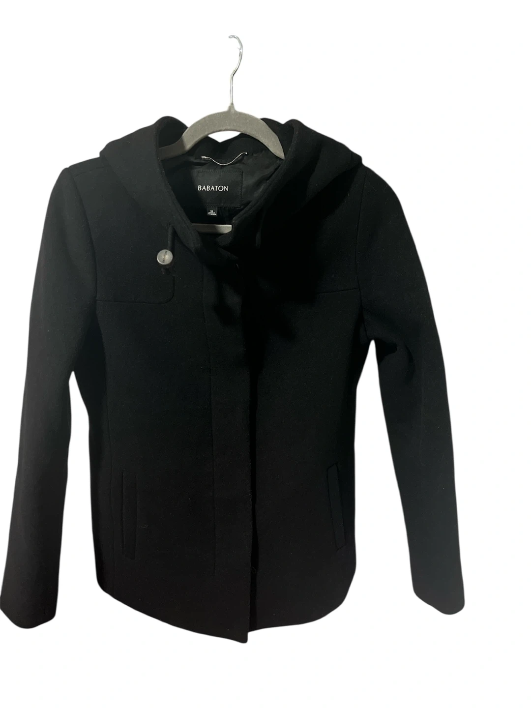25Selling a Babaton jacket in size XS. It's a stylish black jacket made with a fine Italian virgin wool and cashmere blend. Perfect for keeping warm and looking great!