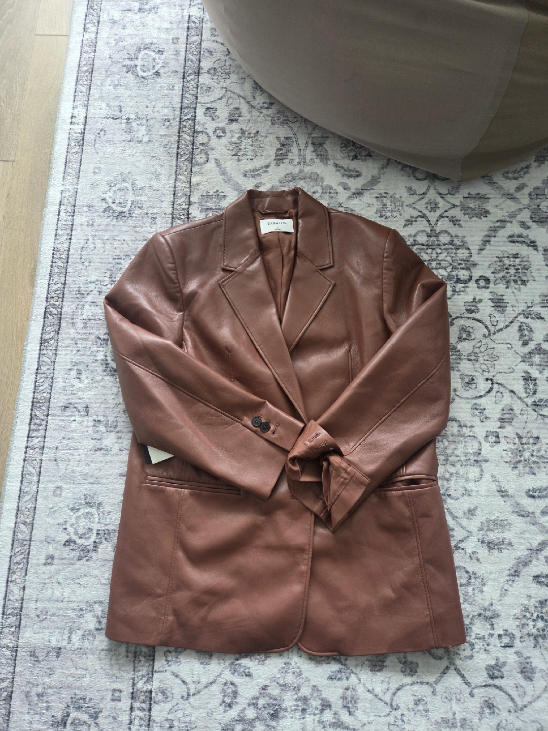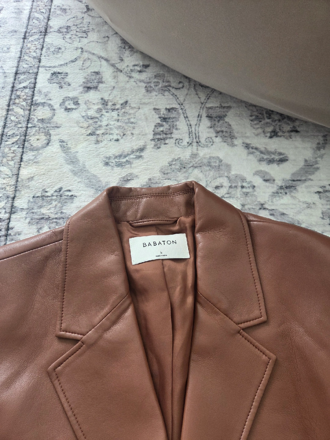 10Selling a stylish brown leather blazer from Babaton in size L. It's in great condition and would make a fantastic addition to any wardrobe! The blazer is made of faux leather and features a classic design.