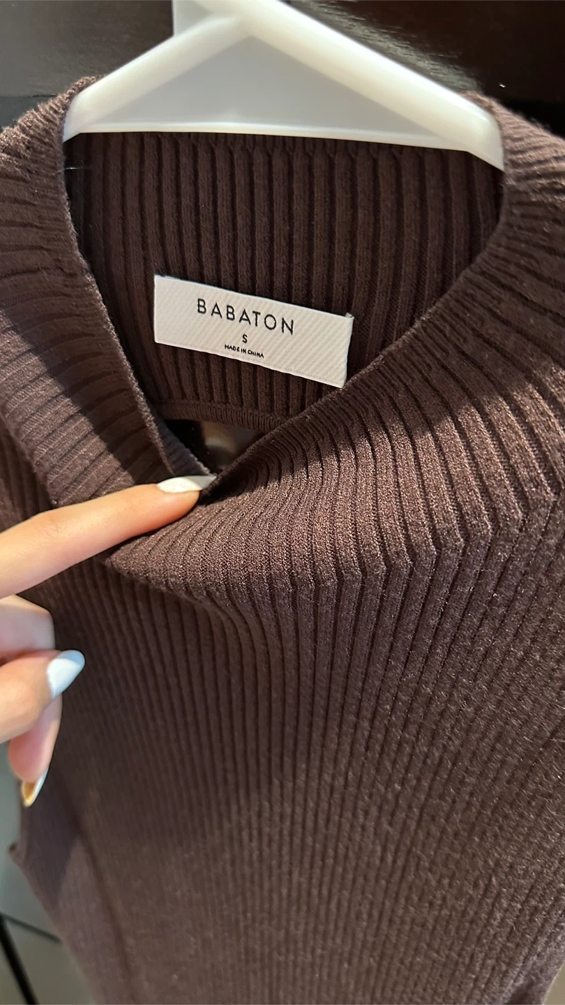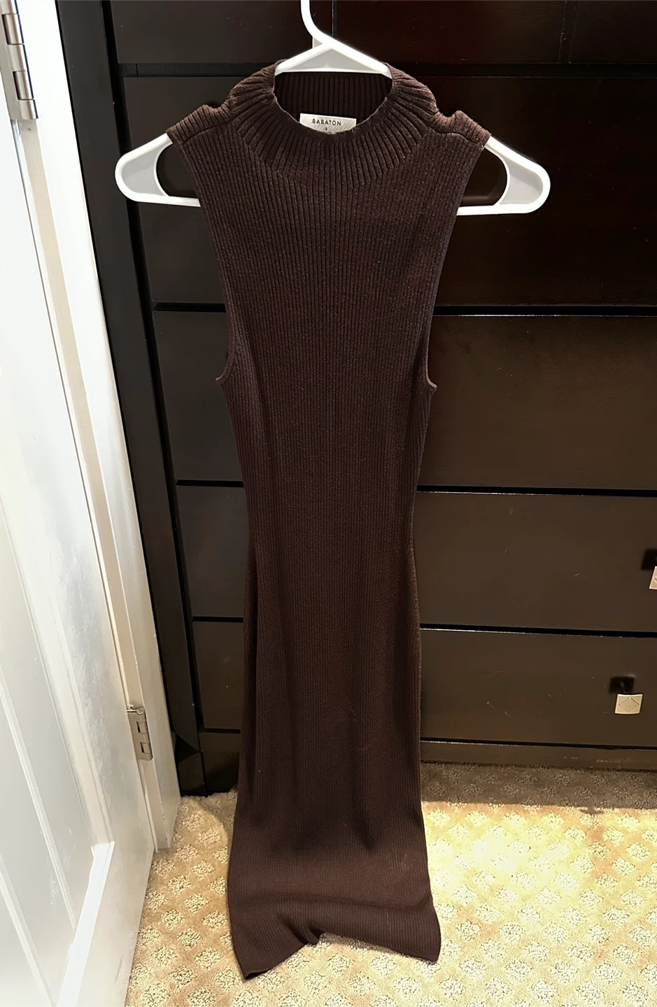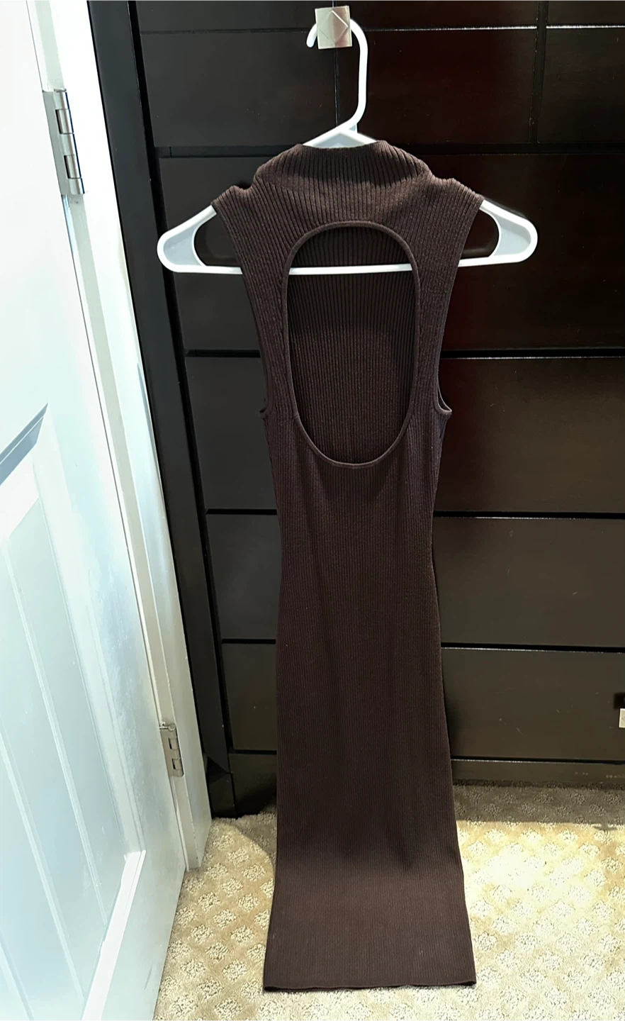 65Selling a Babaton knit dress in a lovely brown colour! It's a size small and features a unique open back design. Perfect for a night out or a casual day. In great condition!