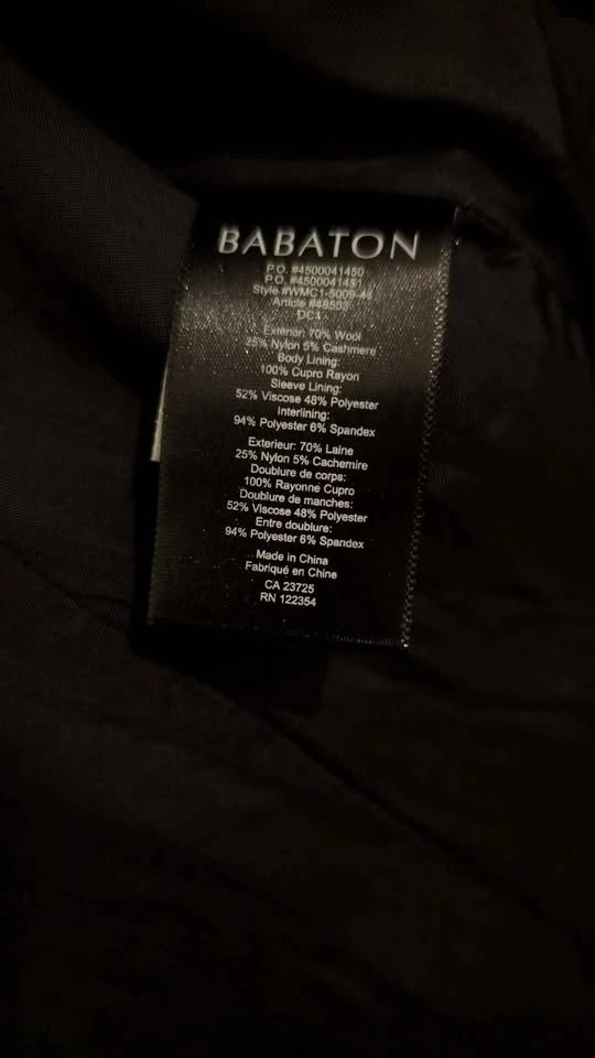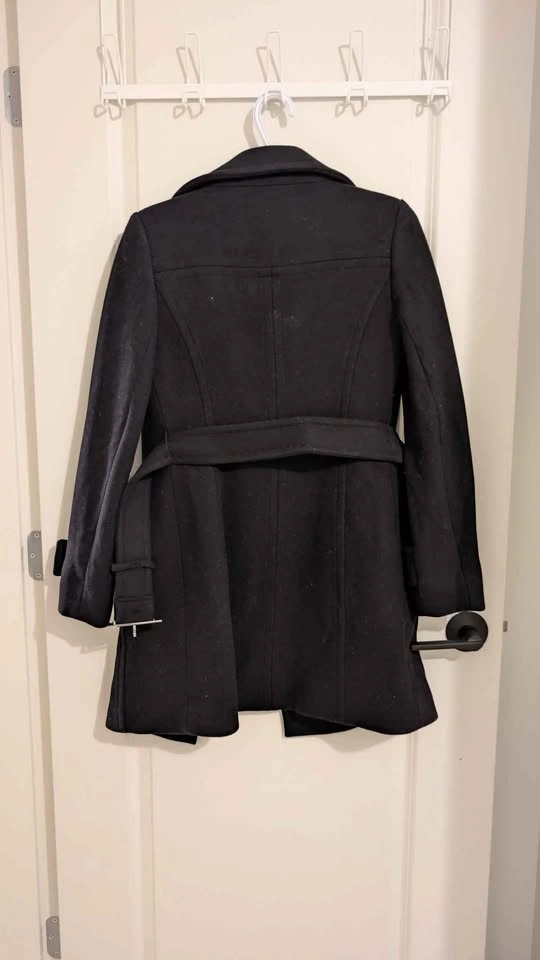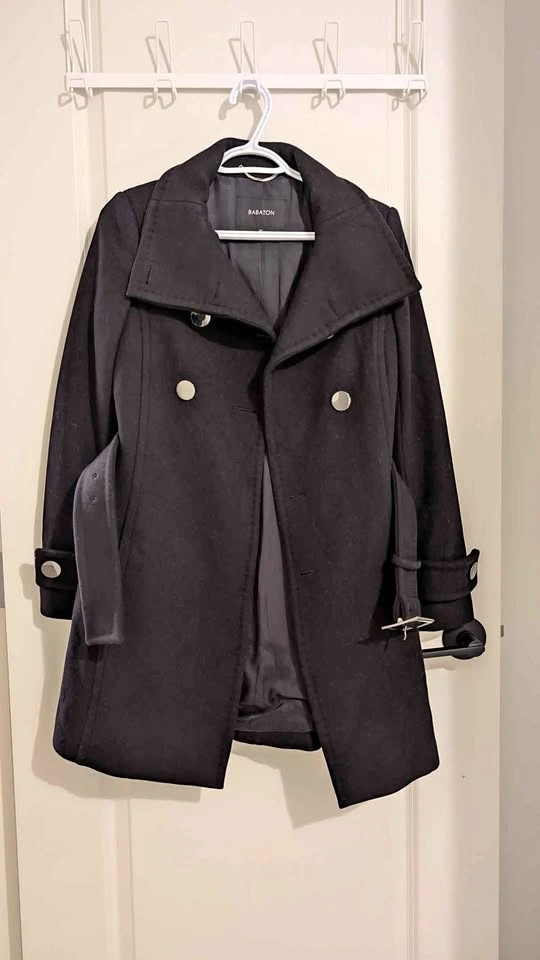 70% wool, 5% cashmere. Includes belt. Barely used.