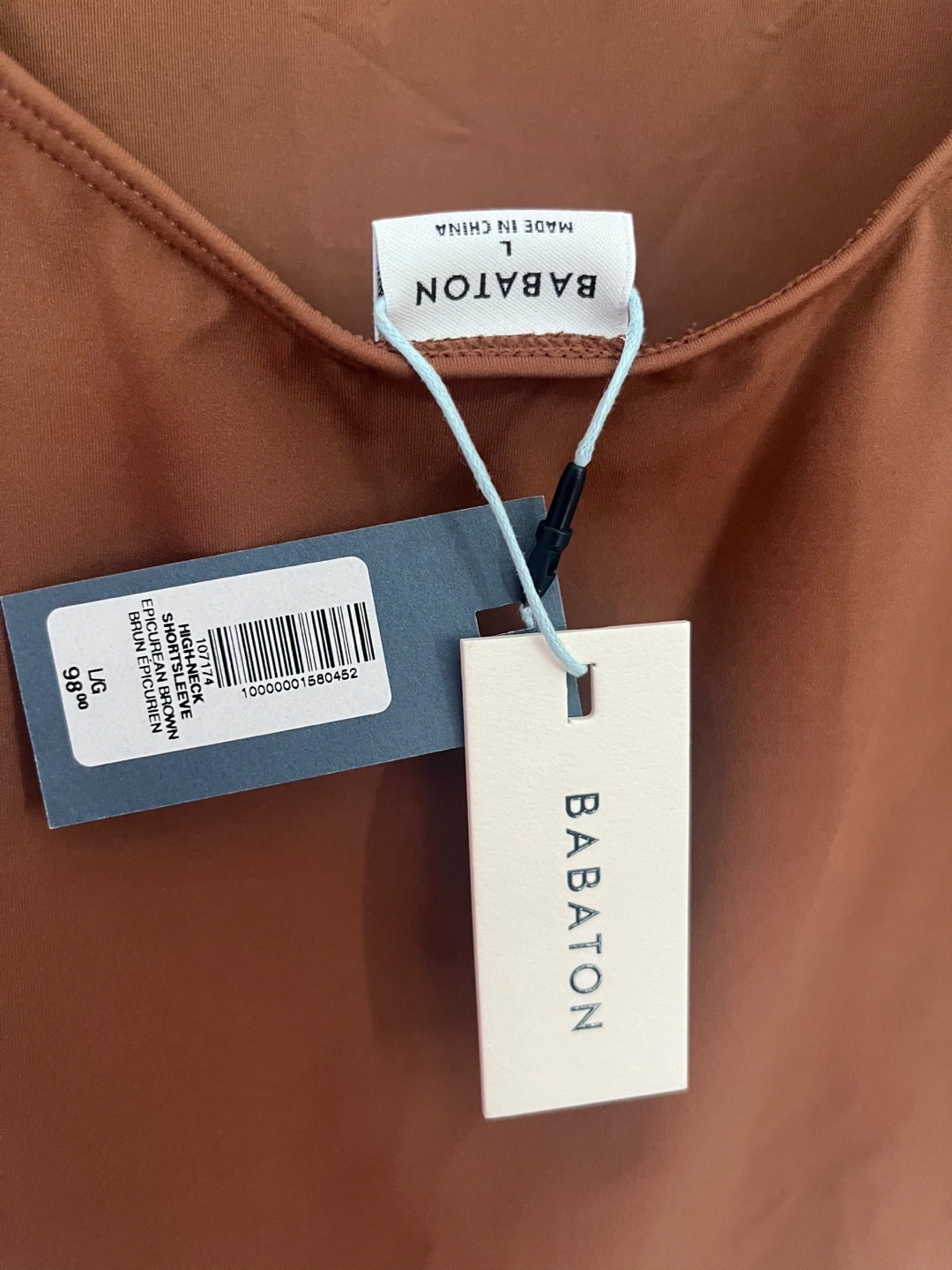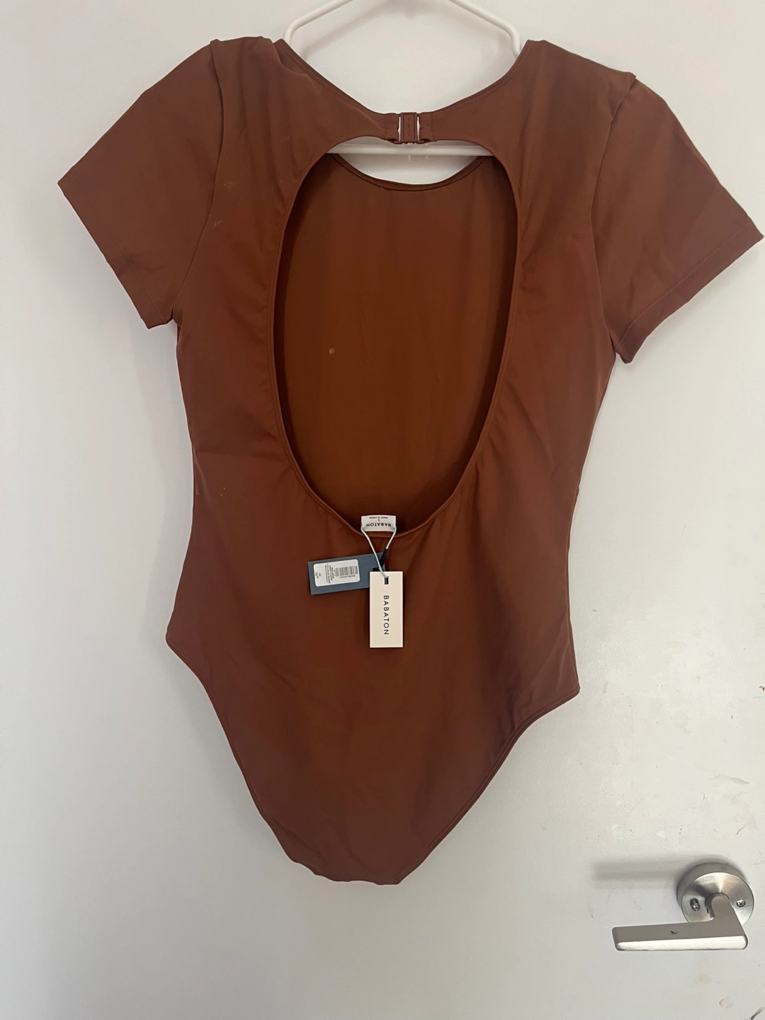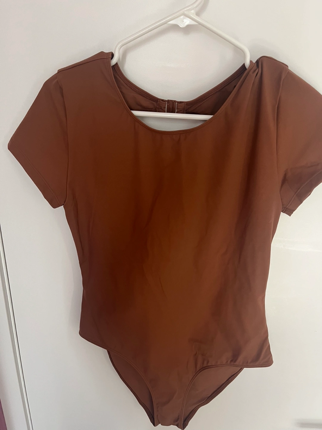 A brown bodysuit, short sleeved. Features a high neck and a cut-out in the back. You might like to wear this on a relaxing day at home or beach!