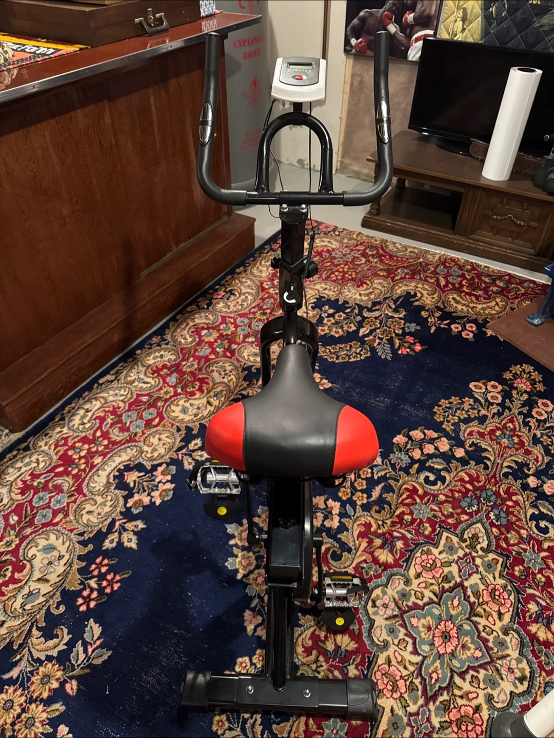 Indoor cycling stationary bike. Great for home workouts. Features adjustable resistance and comfortable seat. Black frame with red accents.