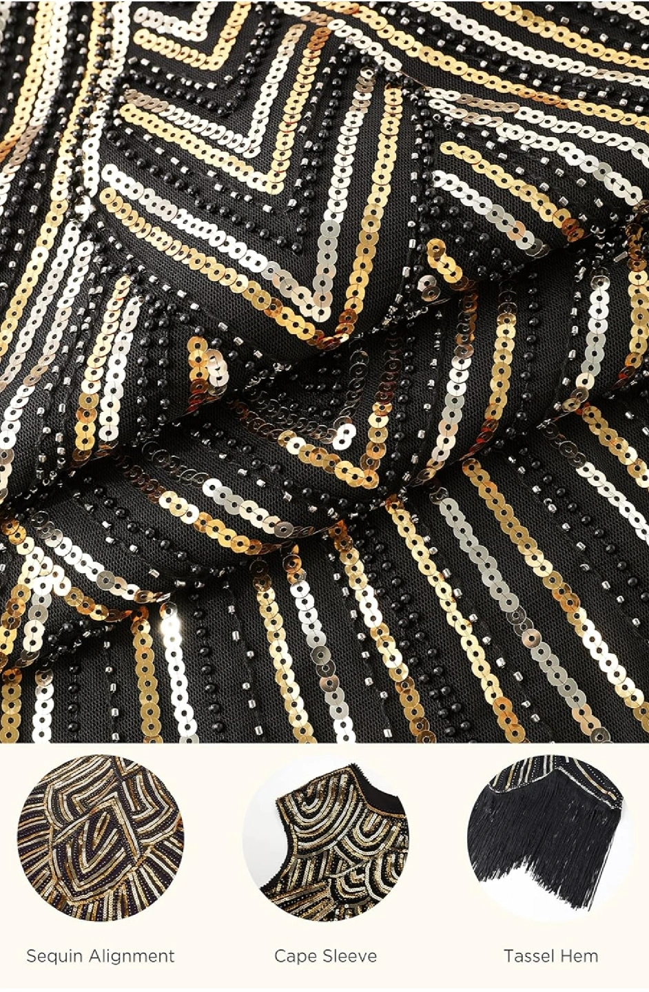 10Selling a gorgeous flapper dress! It features a stunning black and gold sequin design with a fun tassel hem. Perfect for a party or special occasion. Size is unknown, so please refer to the photos!
