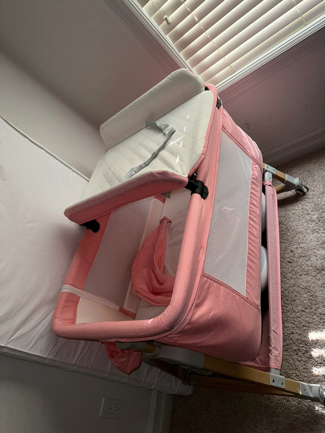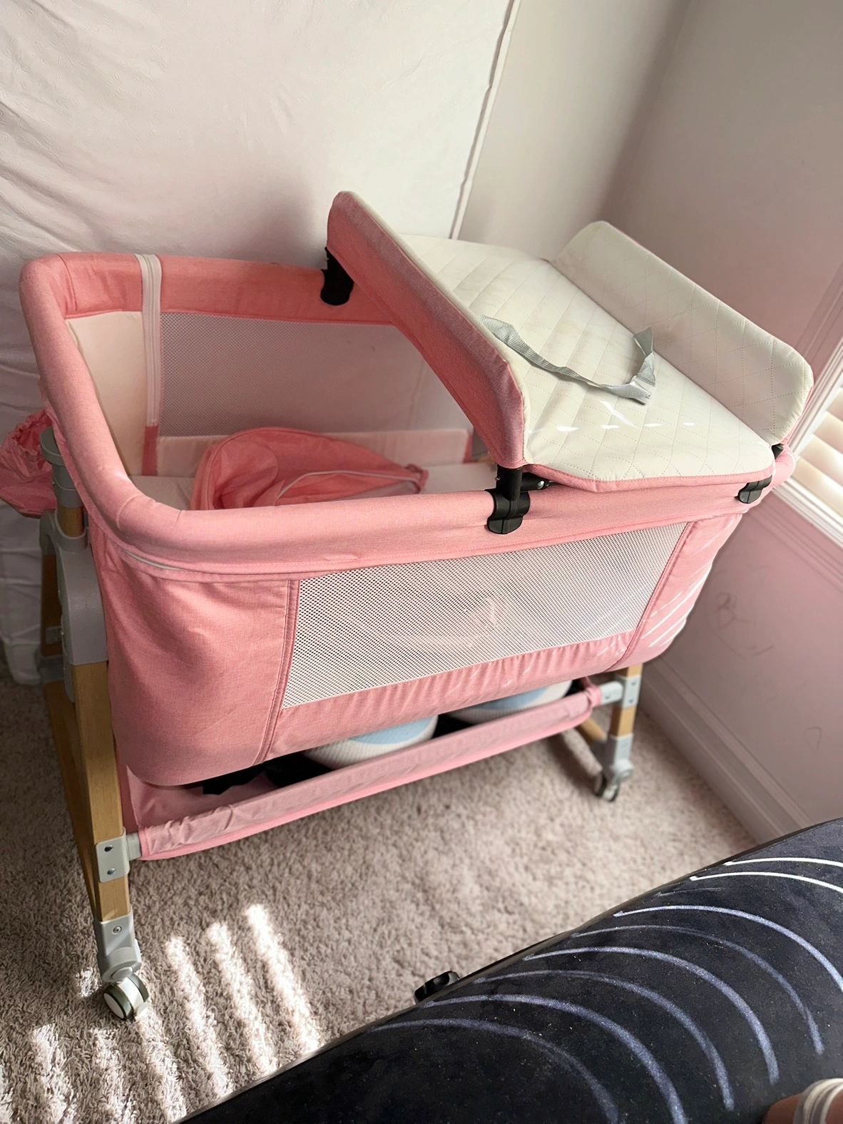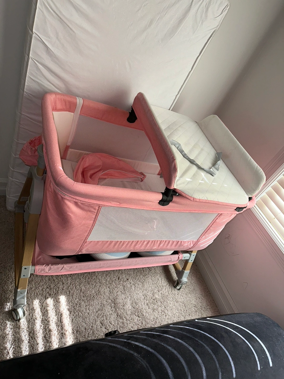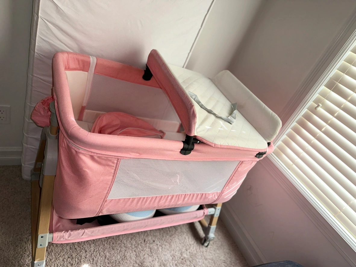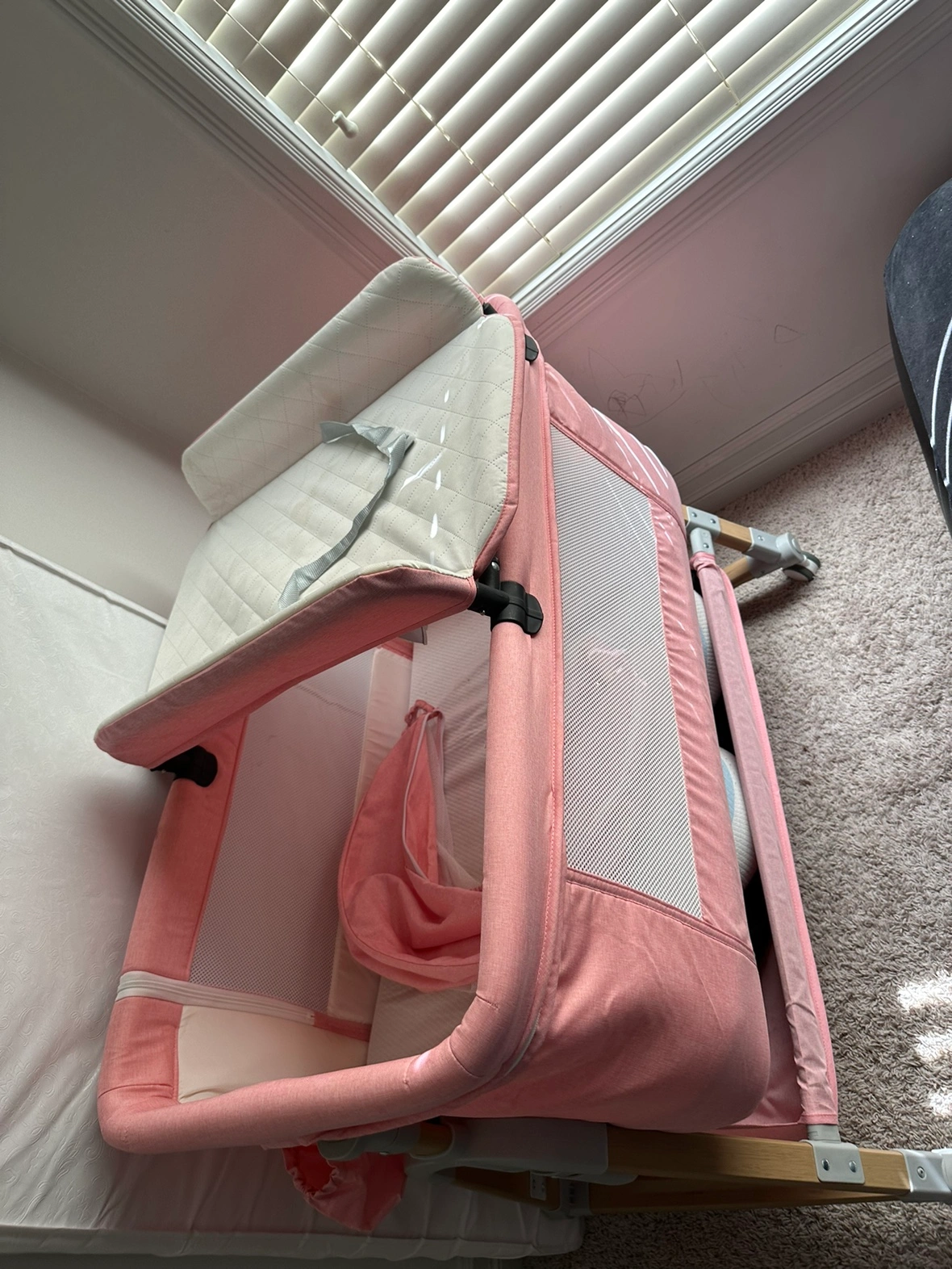 Pink baby co-sleeper with changing table and storage. Comes with a few accessories. Wheels allow for easy manoeuvrability.