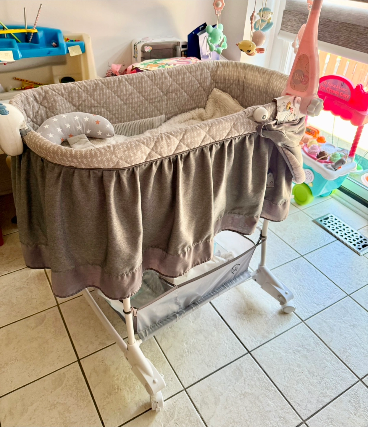 Gently used baby bassinet in great condition! It's a cozy and convenient option for newborns. Features a neutral grey colour that fits well in any nursery. Comes with a storage basket underneath for baby essentials. Great for small spaces.