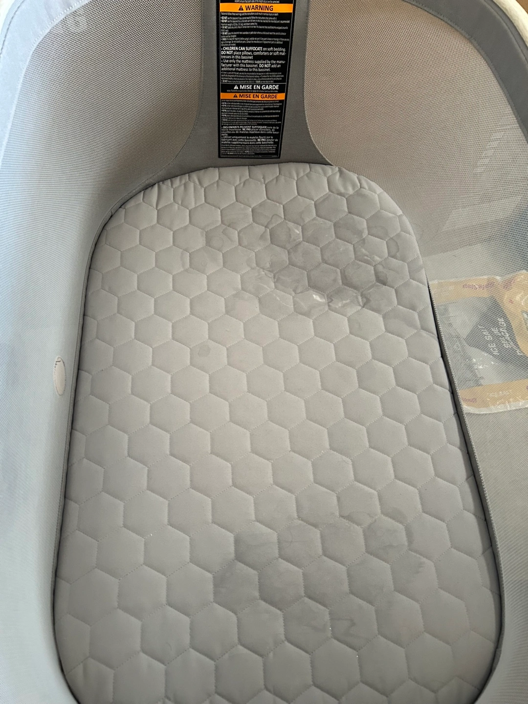 Bassinet with mesh sides. Features a light-coloured frame. The mattress is light grey and hexagon-patterned, offering a comfortable surface for your baby. Easy slide function to get the right position Comfortable mattress so baby can sleep soundly Breathable mesh sides so you can easily keep an eye on baby Multiple height positions to adjust to the right height Large storage basket to hold everything needed to care for baby. Folds and stores in a travel bag to easily take wherever you want to go