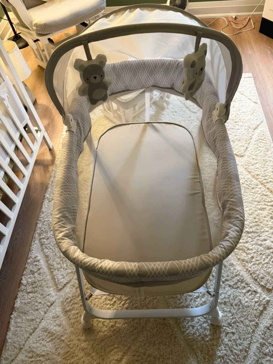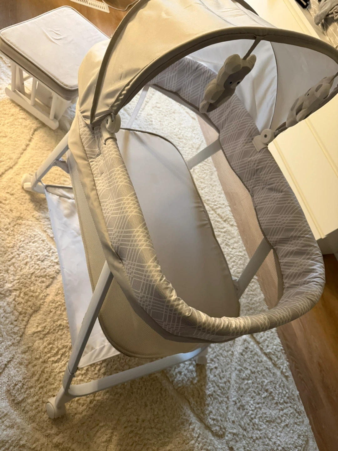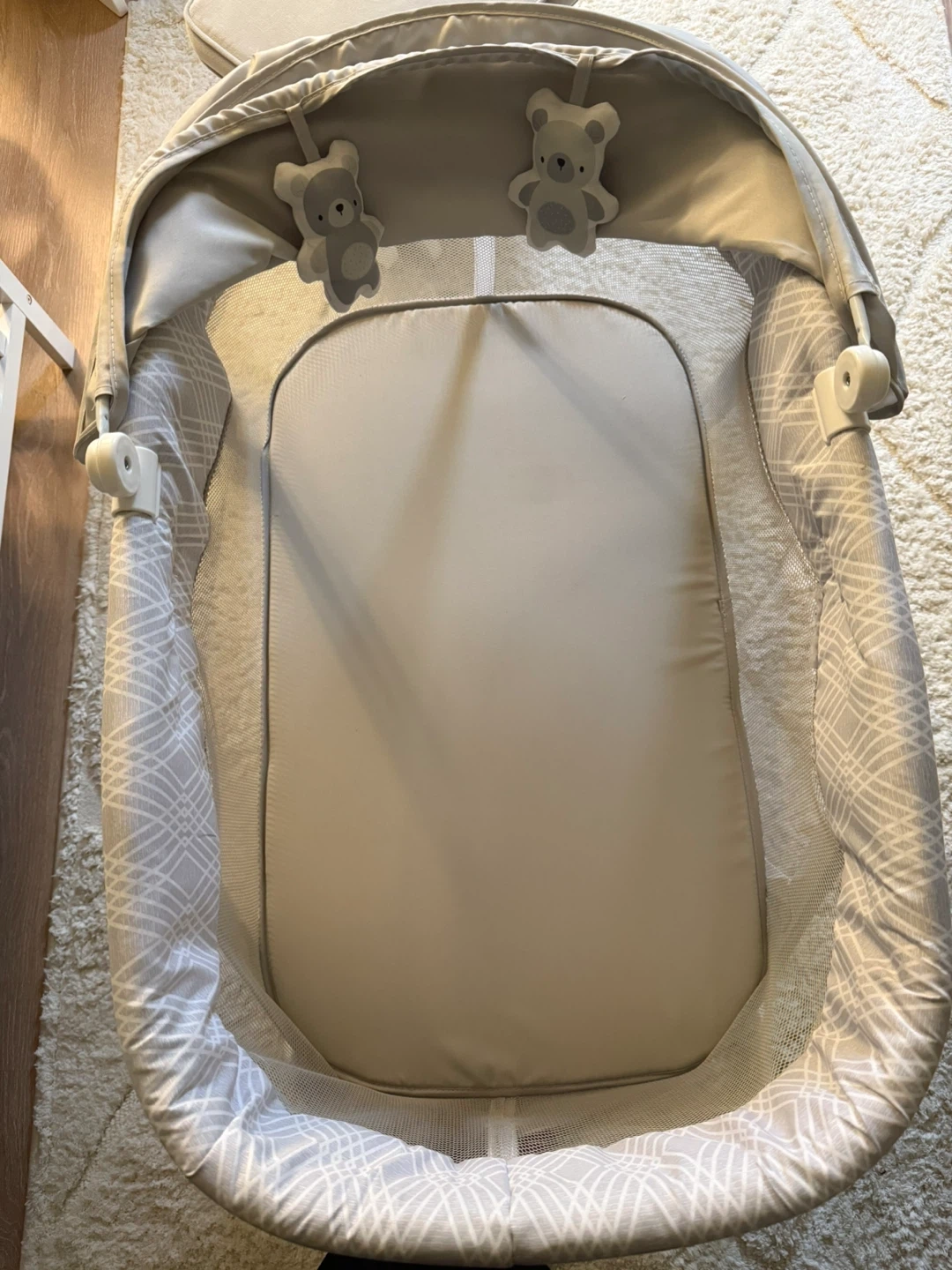 Gently used baby bassinet featuring a neutral colour scheme and a convenient canopy! The bassinet is in great shape and ready for a new little one. It comes with a storage shelf underneath for diapers and other baby essentials.
