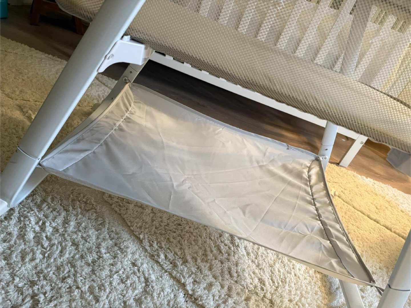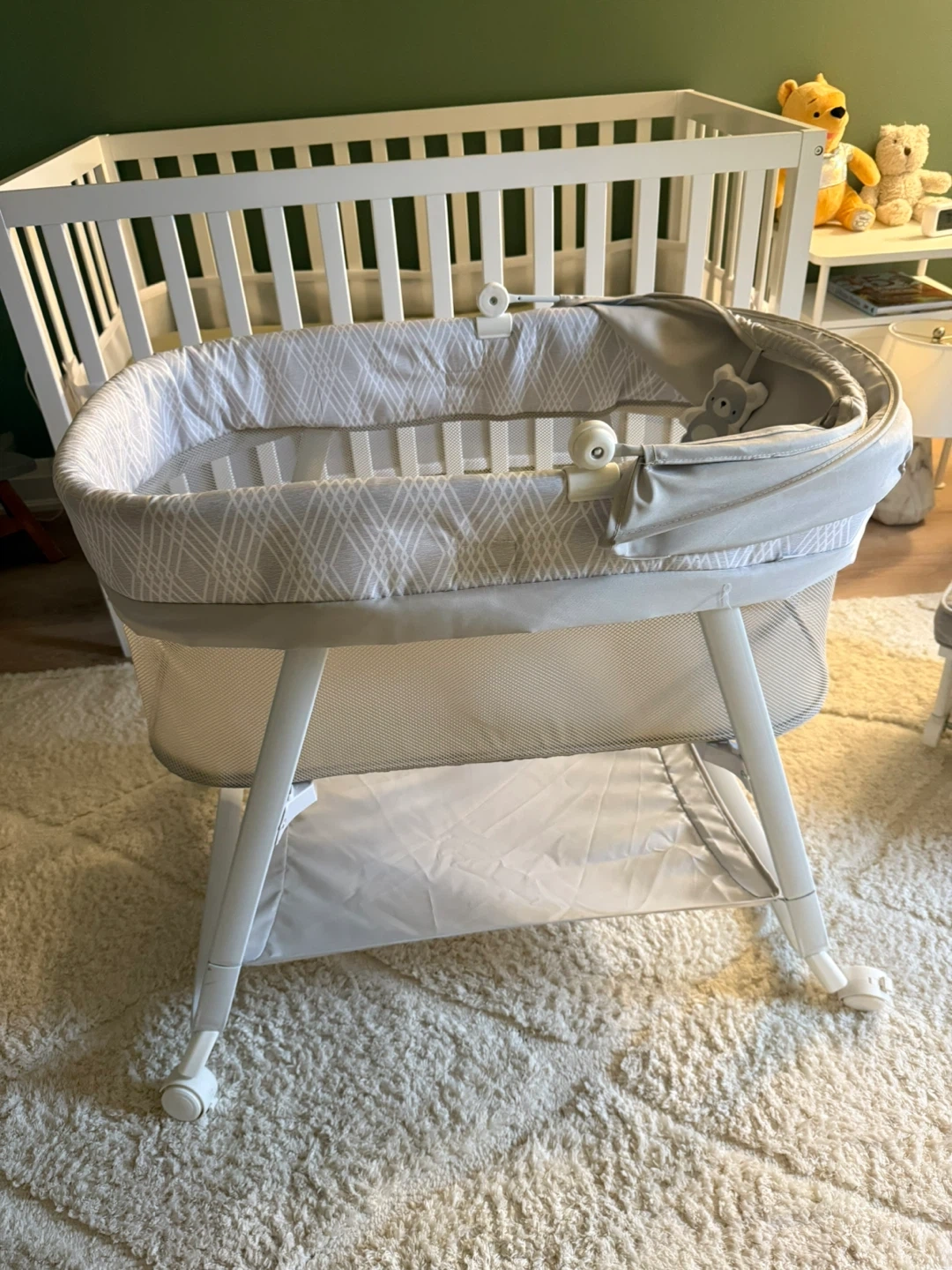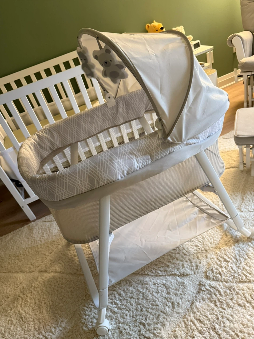 Gently used baby bassinet featuring a neutral colour scheme and a convenient canopy! The bassinet is in great shape and ready for a new little one. It comes with a storage shelf underneath for diapers and other baby essentials.