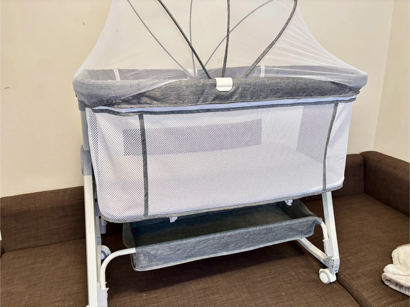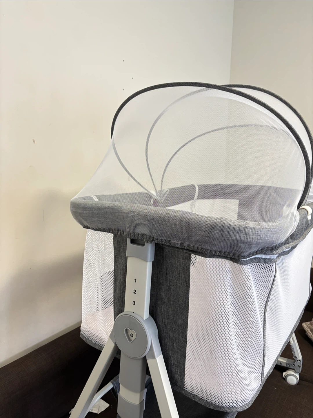 10Selling a gently used baby bassinet in great condition! It features a grey fabric lining and white mesh sides for visibility and breathability. A mosquito net is included to keep your little one protected. It also has a storage area underneath for baby essentials