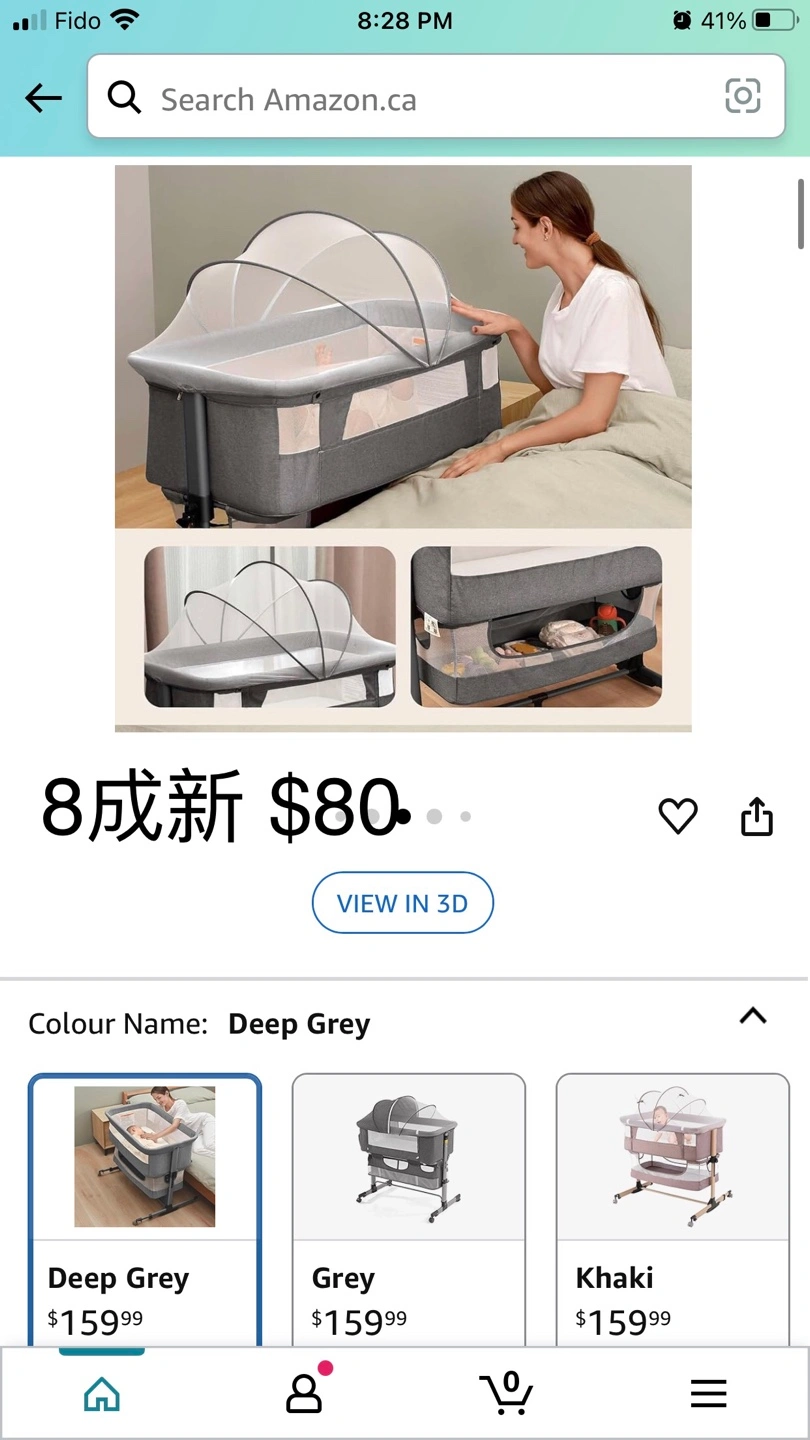 Like-new baby bassinet. Deep grey colour. Includes mosquito net. Portable and easy to assemble.