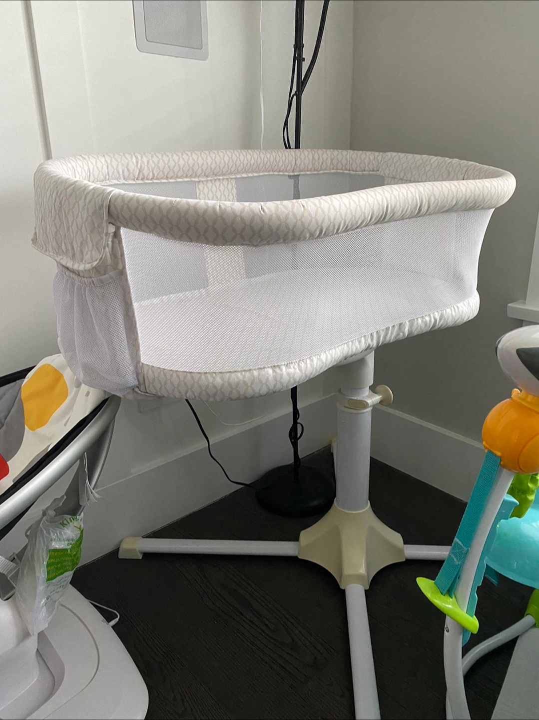 55Baby bassinet, white mesh sides, beige patterned fabric, stand included. Easy to assemble.