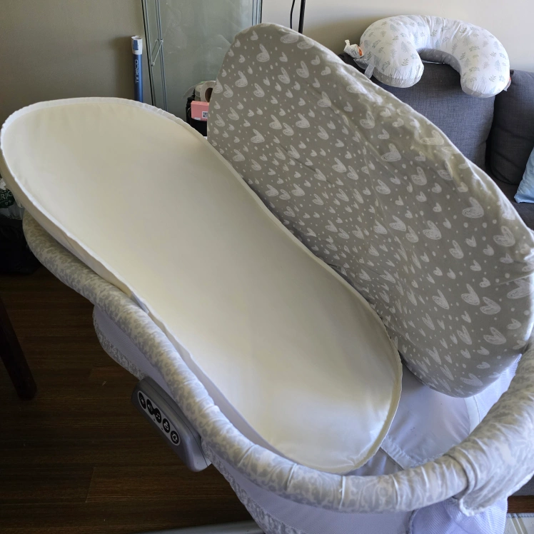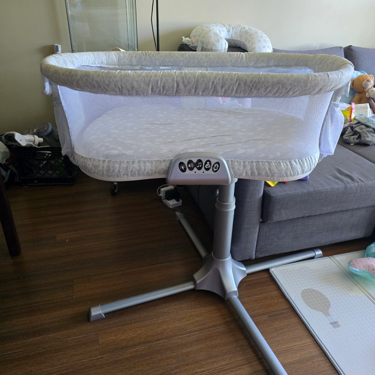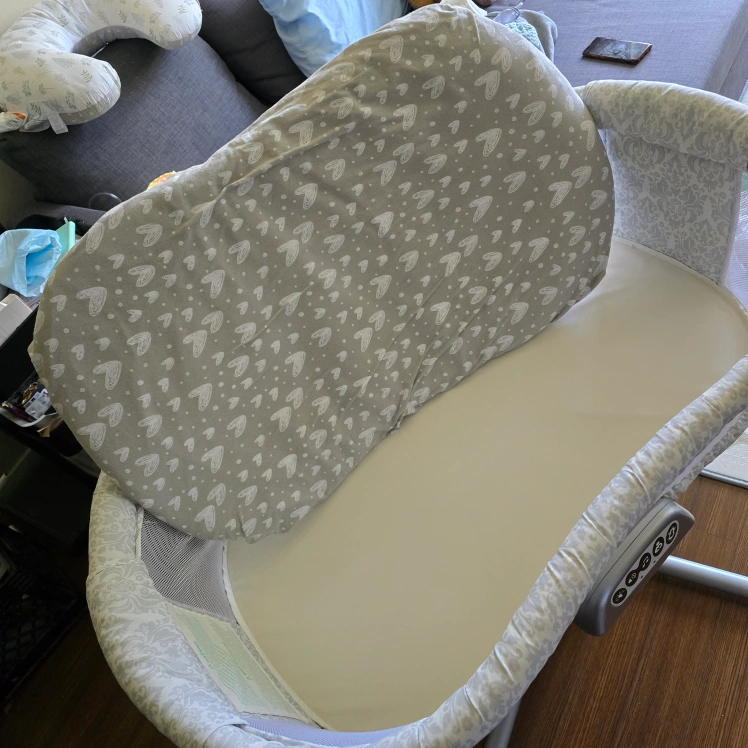 Baby bassinet, grey and white pattern. Features vibration and music settings. Includes mattress and fitted sheet. Gently used.