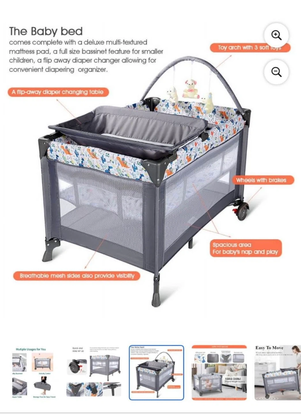 This baby bed comes with a deluxe multi-textured mattress pad and a full-size bassinet feature, perfect for smaller children! It also has a flip-away diaper changer for convenient diapering. The breathable mesh sides provide visibility, and it includes a toy arch with 3 soft toys. It's easy to move around with its wheels and brakes, offering a spacious area for baby's nap and play