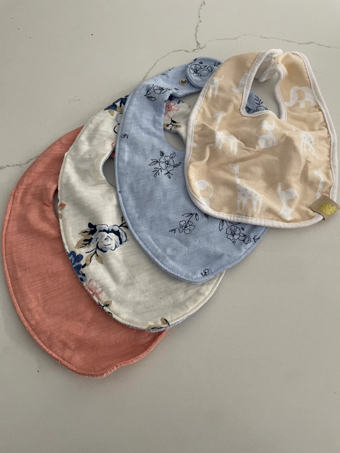 107Here's a set of four baby bibs in great condition! They come in a variety of cute prints, including floral and elephant designs.
