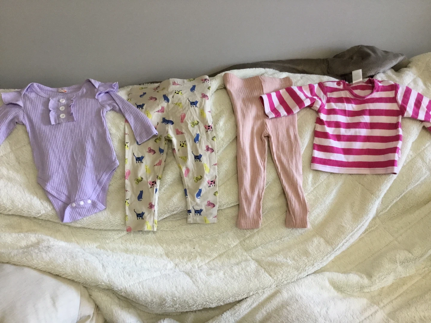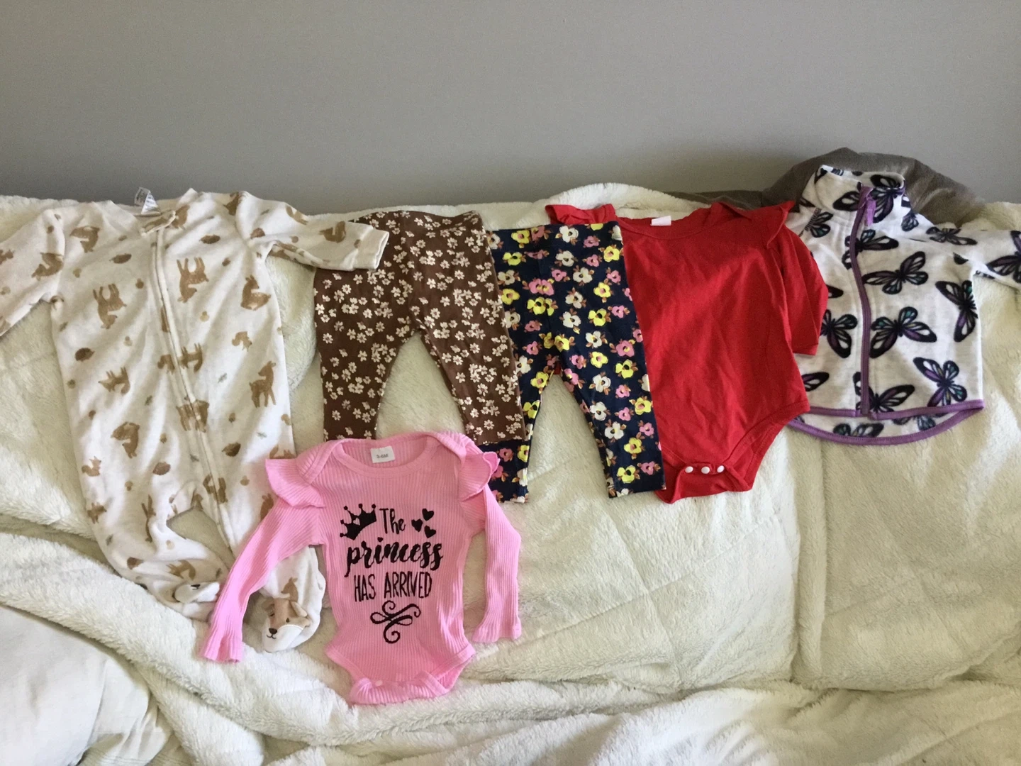 65Selling a bundle of baby clothes in various colours and patterns, including bodysuits, pants, and a sleeper. Also included are a pair of adorable silver shoes. Perfect for your little one!
