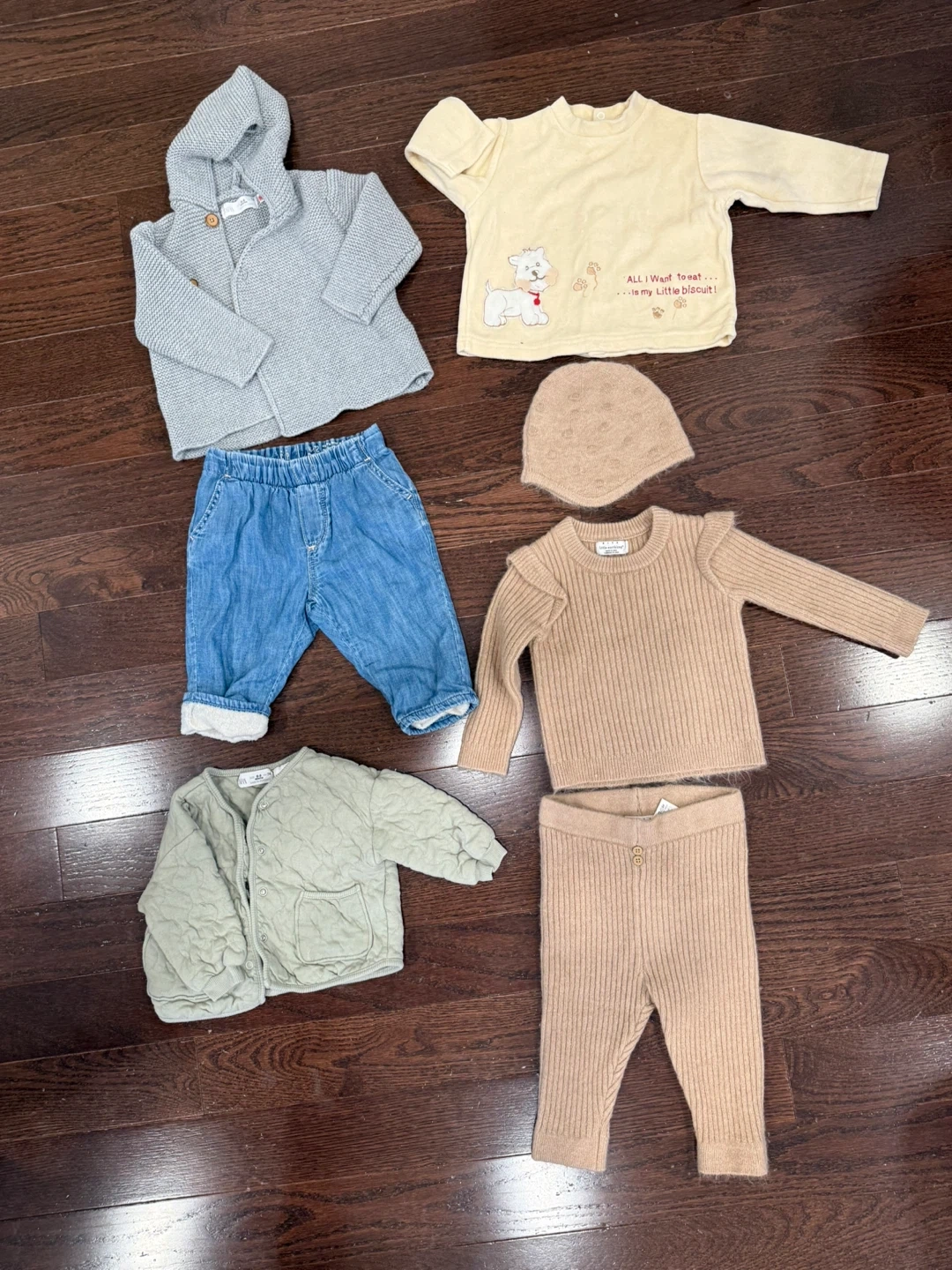 Selling a cute bundle of baby clothes! Includes a grey hooded cardigan, a yellow long-sleeved shirt, blue pants, a beige hat, a beige sweater, and matching pants, plus a light green jacket. All in great condition and ready for a new little one!