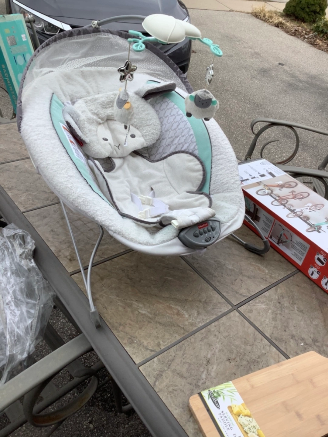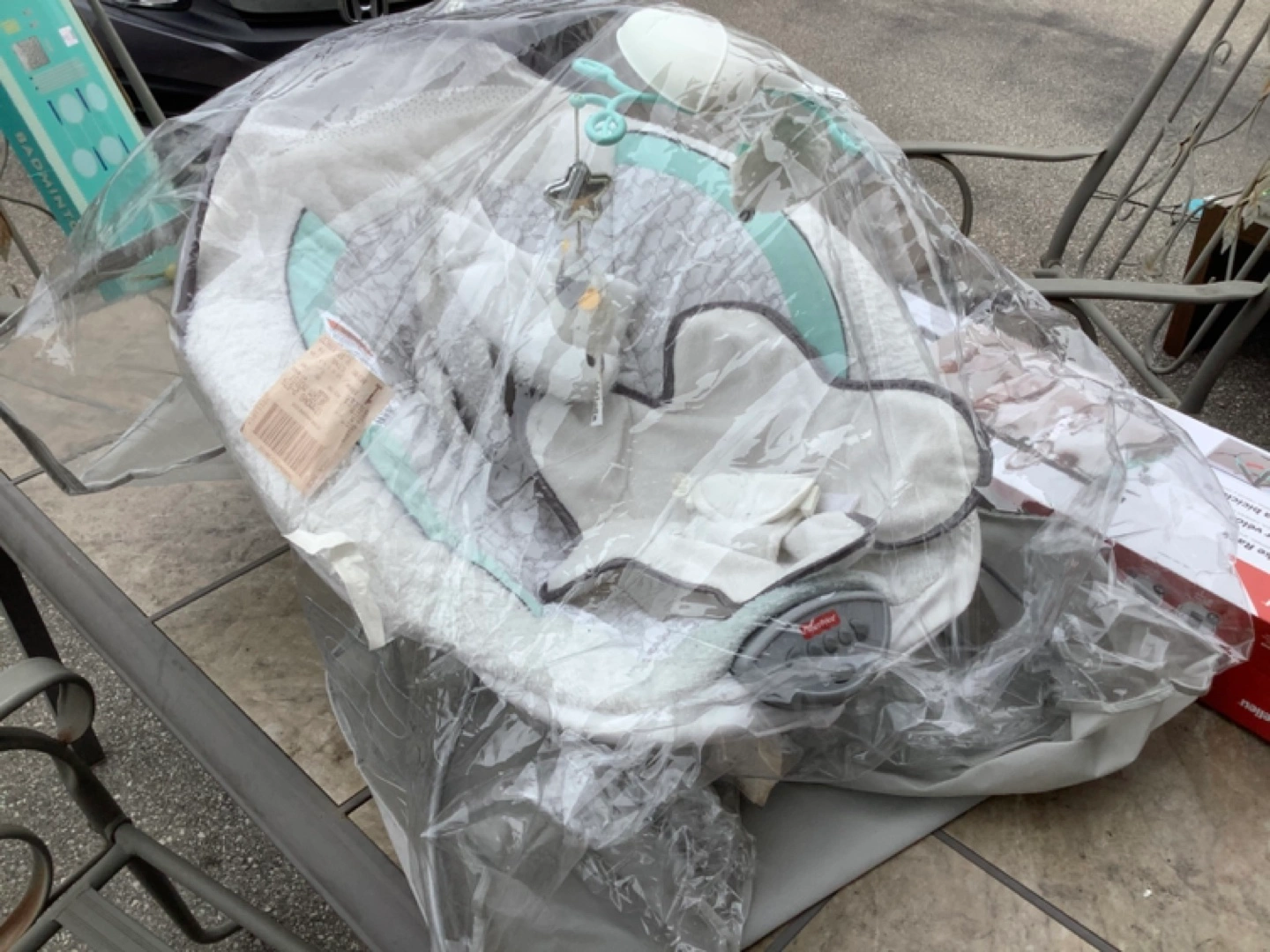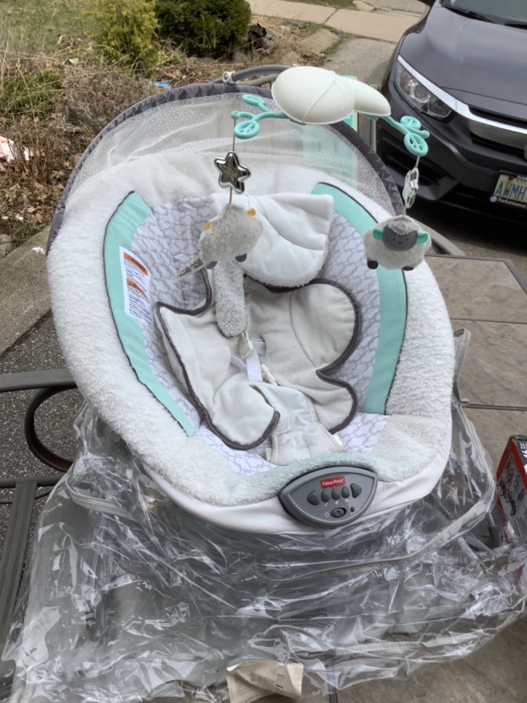 Infant baby swing, lightly used. Grey and mint colour scheme. Includes mobile with sheep toys. Great for newborns and infants. Cloth is washable if needed.