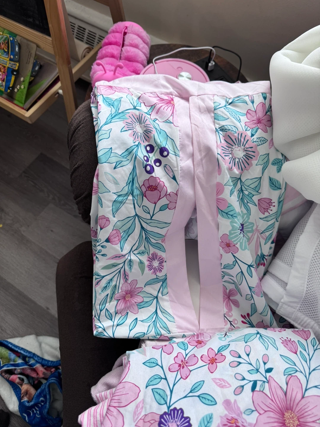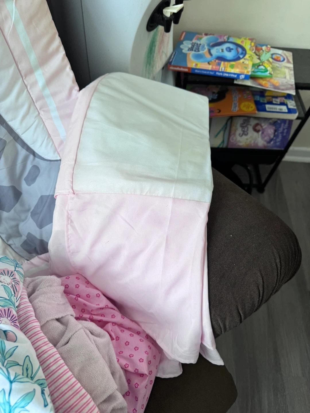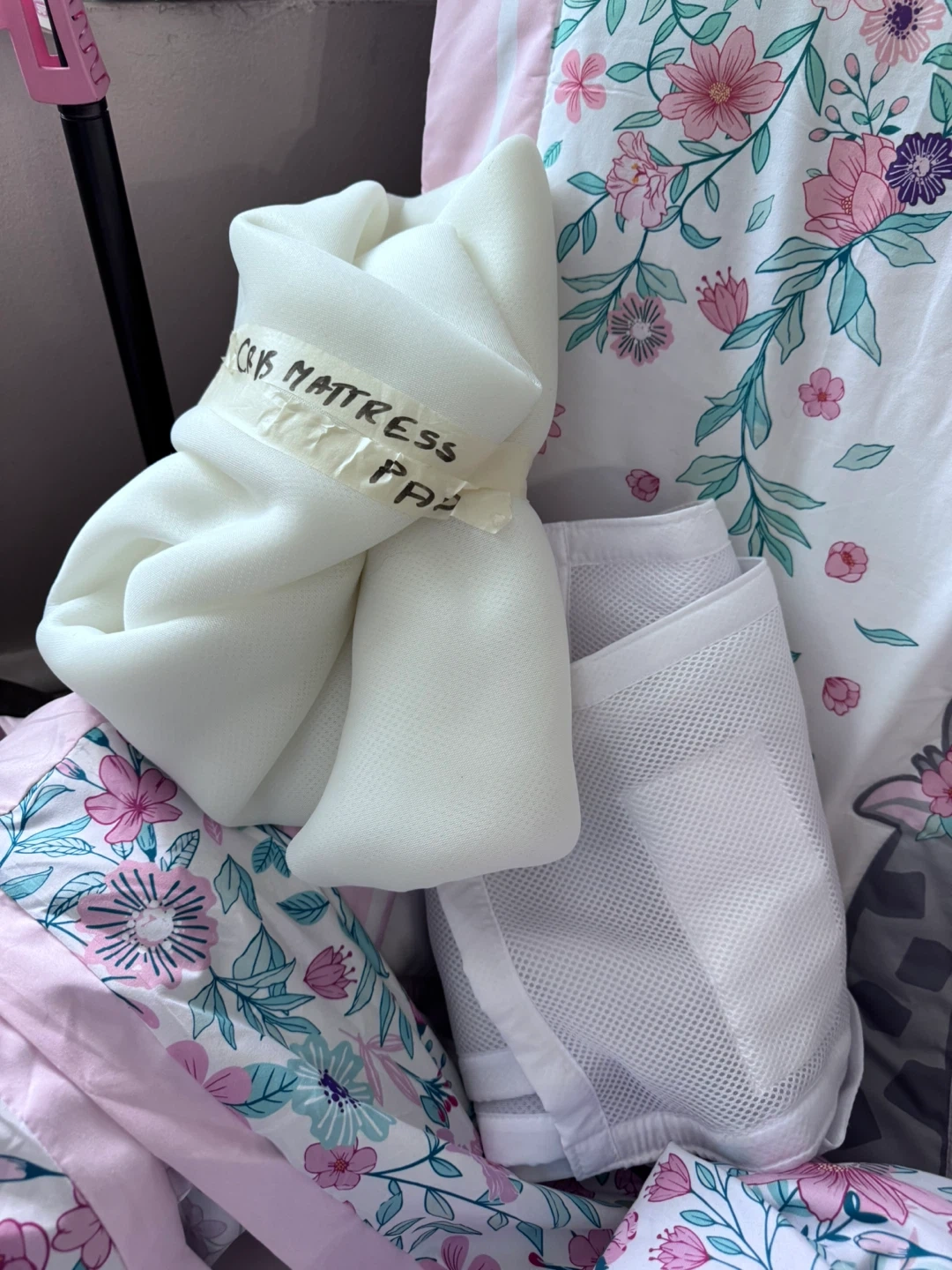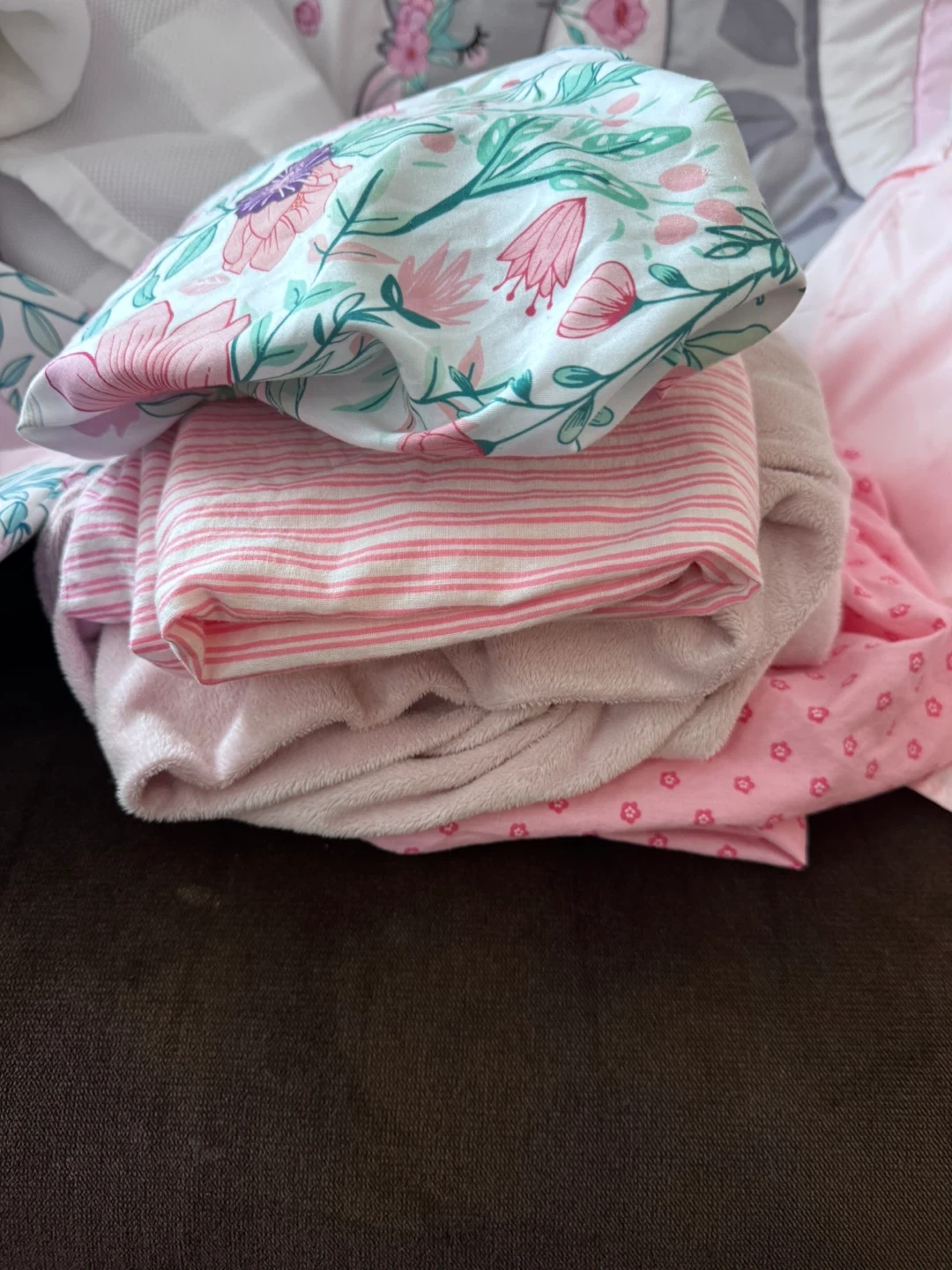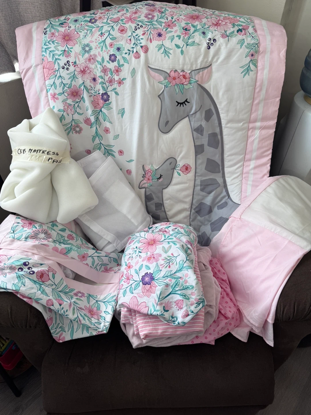 83A cute baby crib bedding set with a floral and giraffe theme! Includes various pieces to set up a comfy crib for your little one. Gently used and in great condition. Comes with comforter, 4 sets of crib sheets, side caddy, mattress pad and breathable crib liner Pick up Centertown
