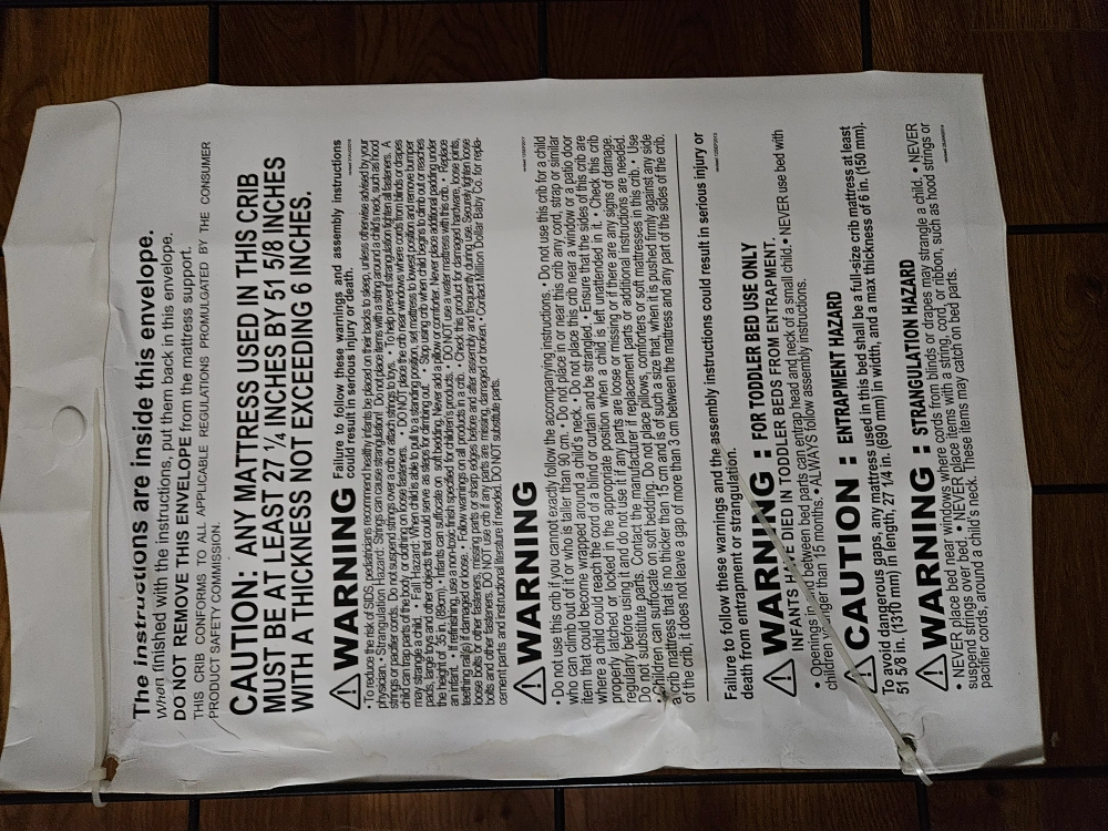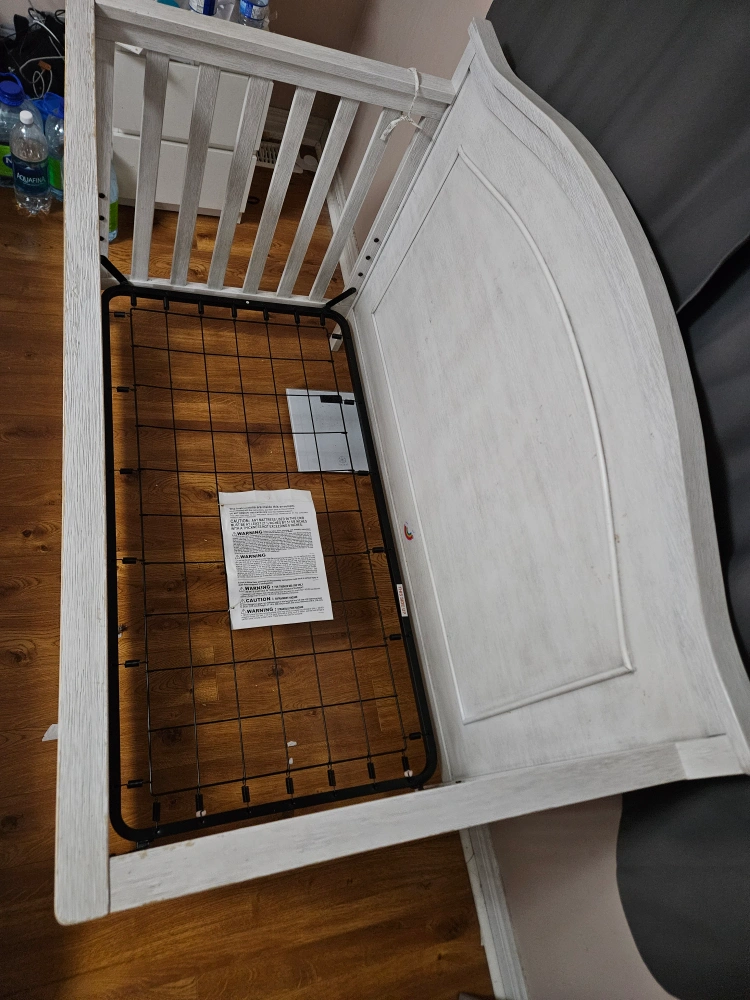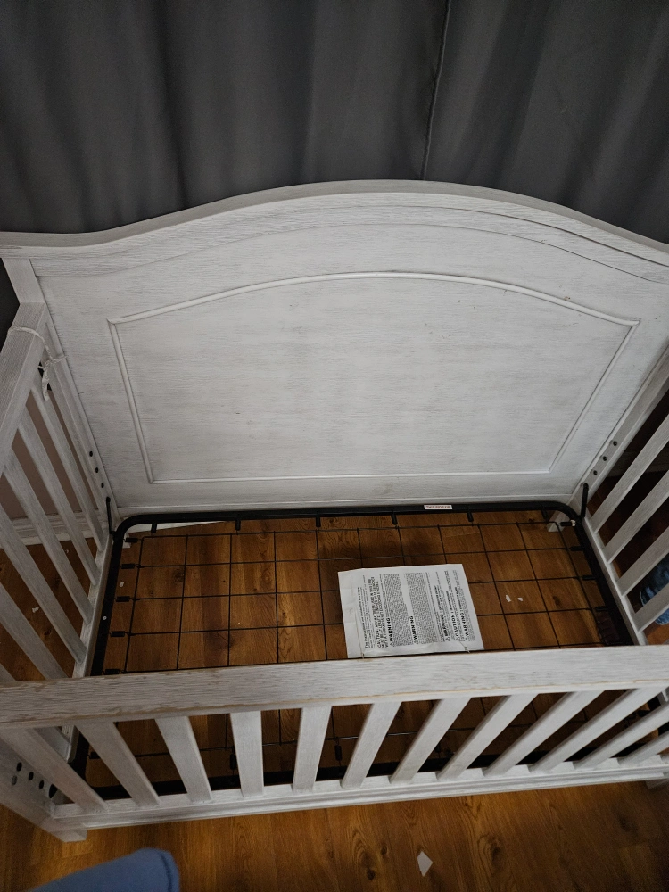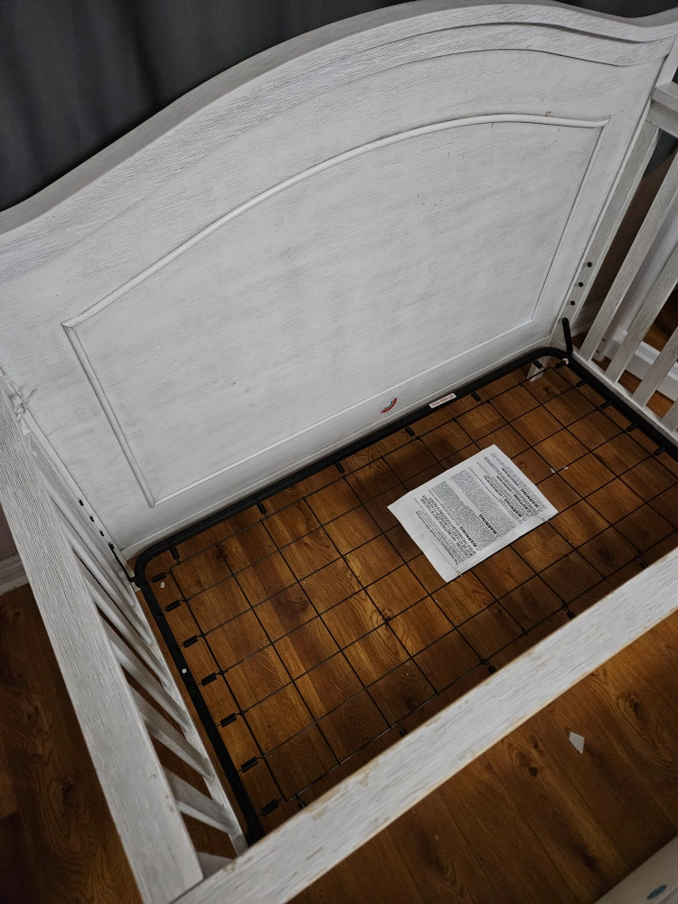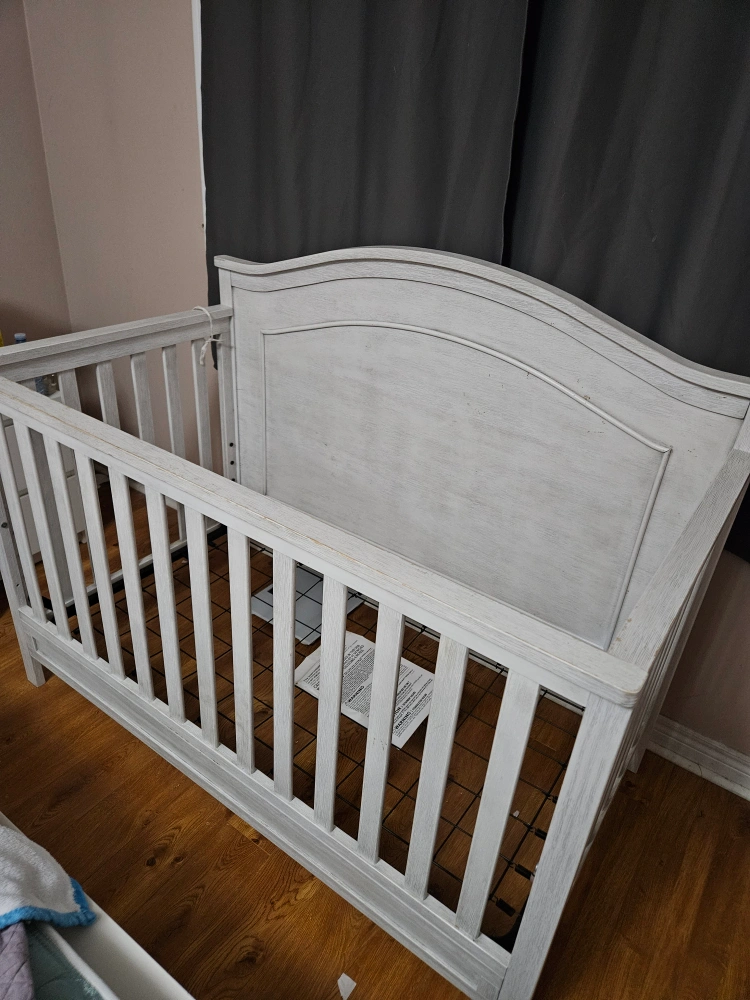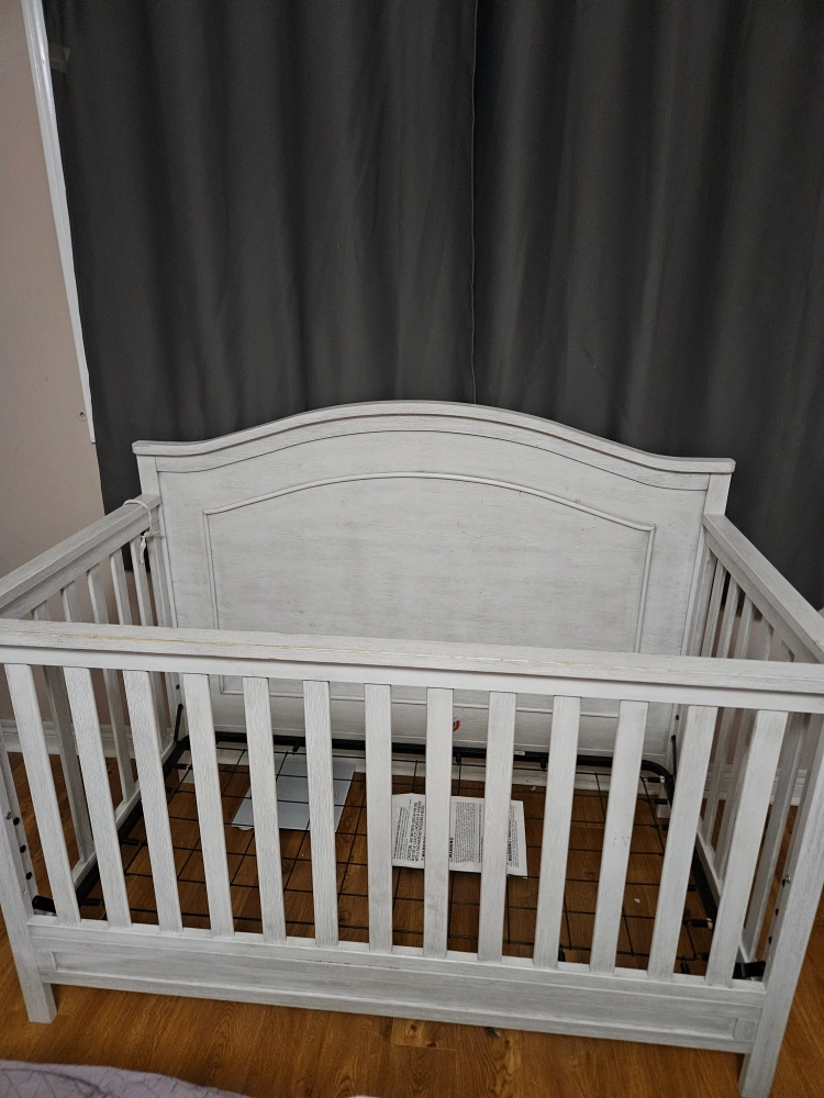 White crib with mattress support. Good condition. 4-in-1 Crib features a graceful arched headboard with delicately carved molding and slim feet. The crib easily converts from crib to toddler bed, daybed and full-size bed.