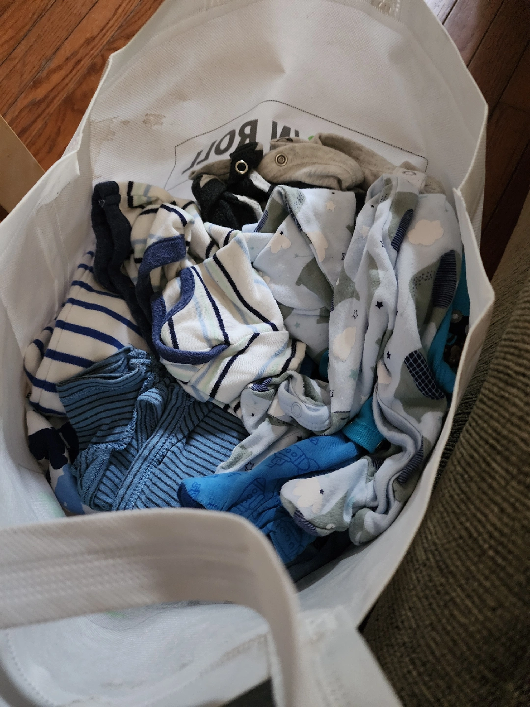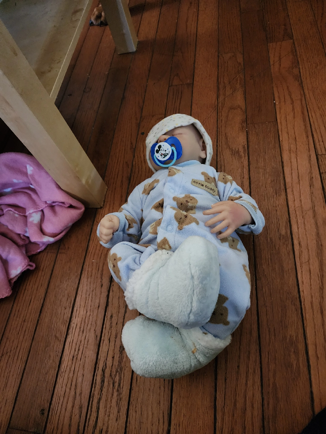 109I'm selling a baby doll with a pacifier and a bag of baby clothes. The doll is wearing a bear-patterned onesie and a hat. The clothes in the bag are various shades of blue and white.