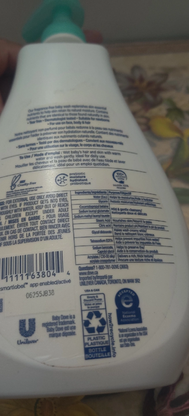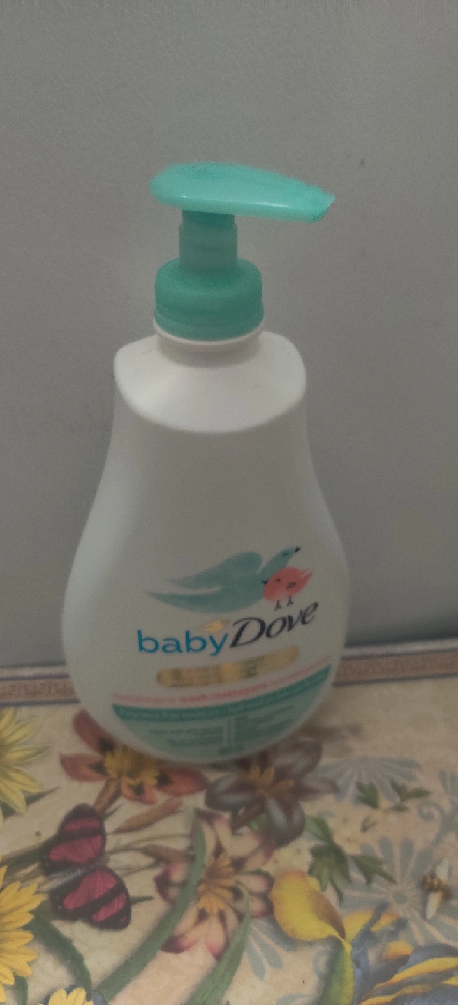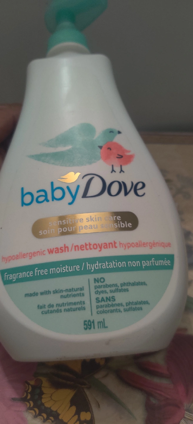Selling a bottle of Baby Dove Sensitive Skin Care hypoallergenic wash. It's a fragrance-free moisture wash that's made with skin-natural nutrients. The bottle contains 591 mL and is perfect for baby's skin and hair. It's hypoallergenic and gentle