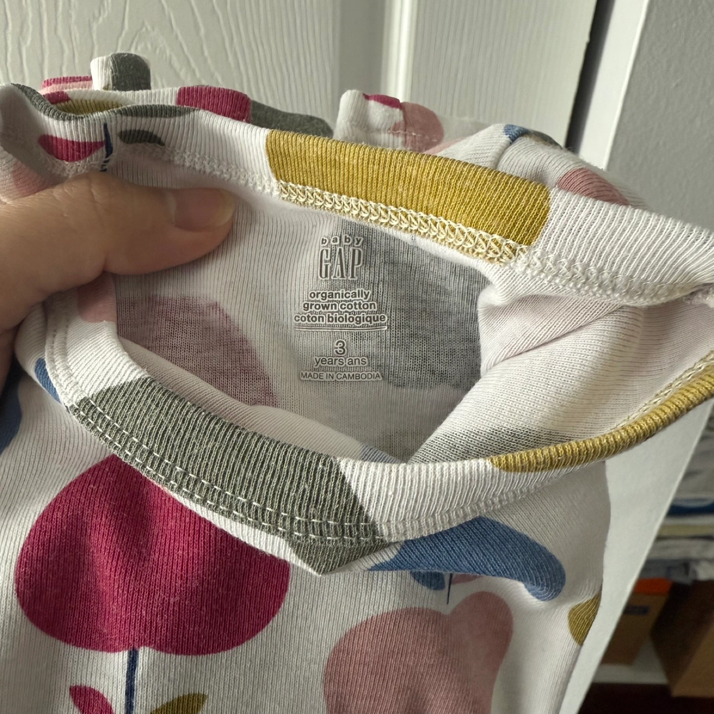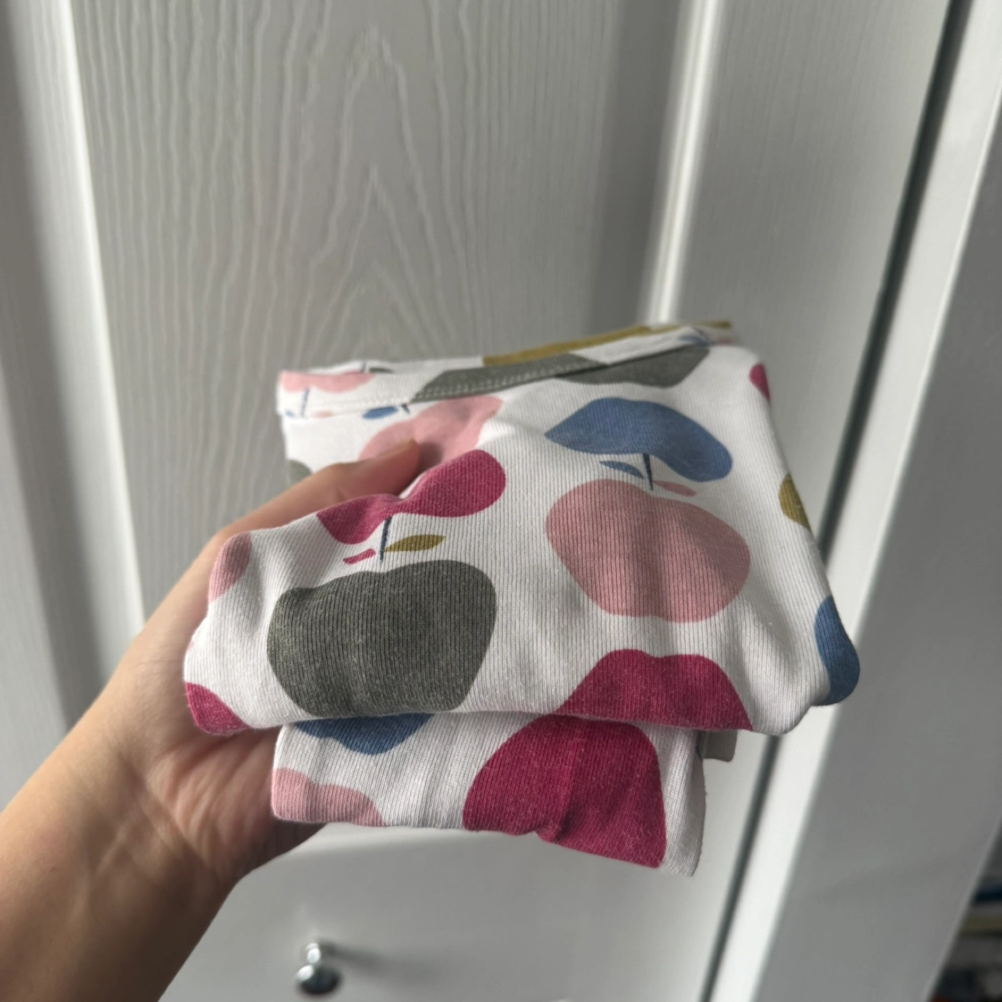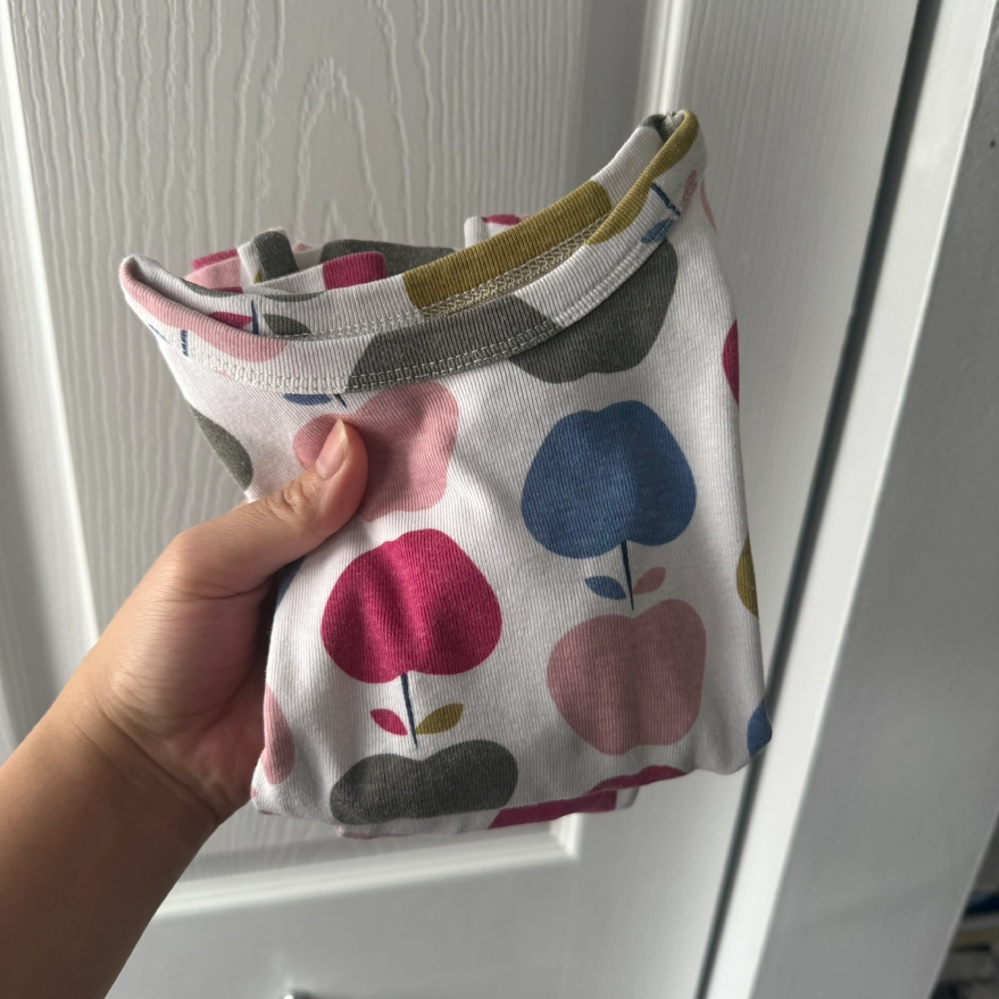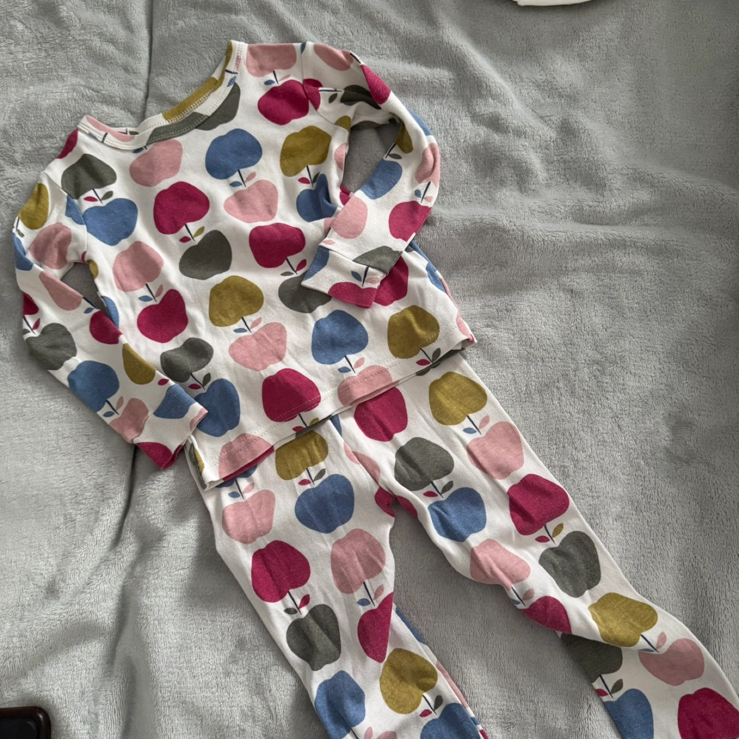 60Adorable pajamas featuring a colourful apple print. Long sleeves and pants. Organically grown cotton. Gently used.