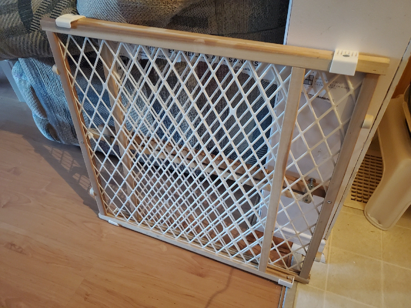 11Selling a baby gate with a wood frame and white mesh. It's in great shape and ready to keep your little one safe!