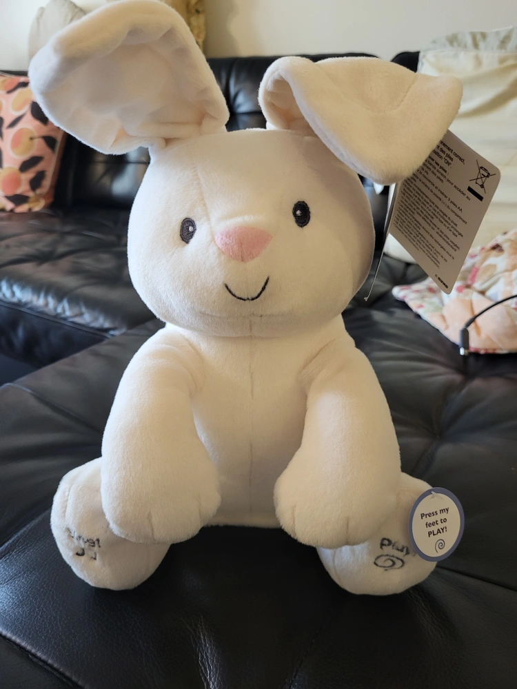 Adorable white bunny plush toy. Sings and plays. Soft and cuddly. Great for babies and toddlers. Gently used.