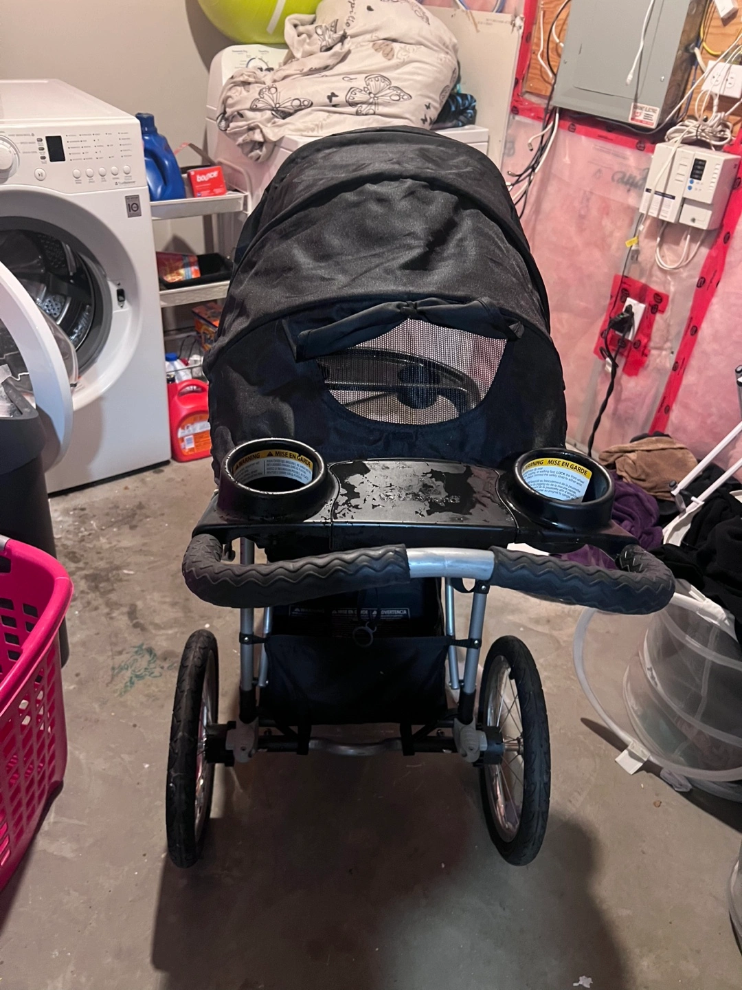 Double stroller with black fabric and silver frame. Features a canopy, cup holders and a storage basket underneath. Comes with a removable parent tray.