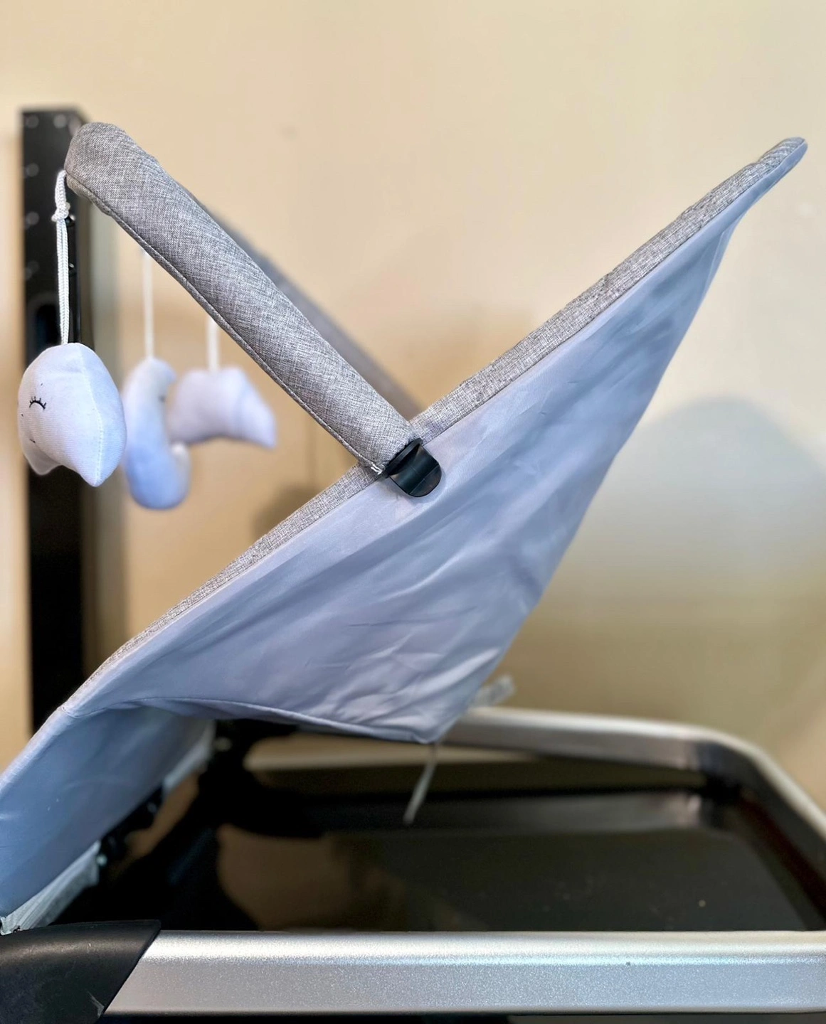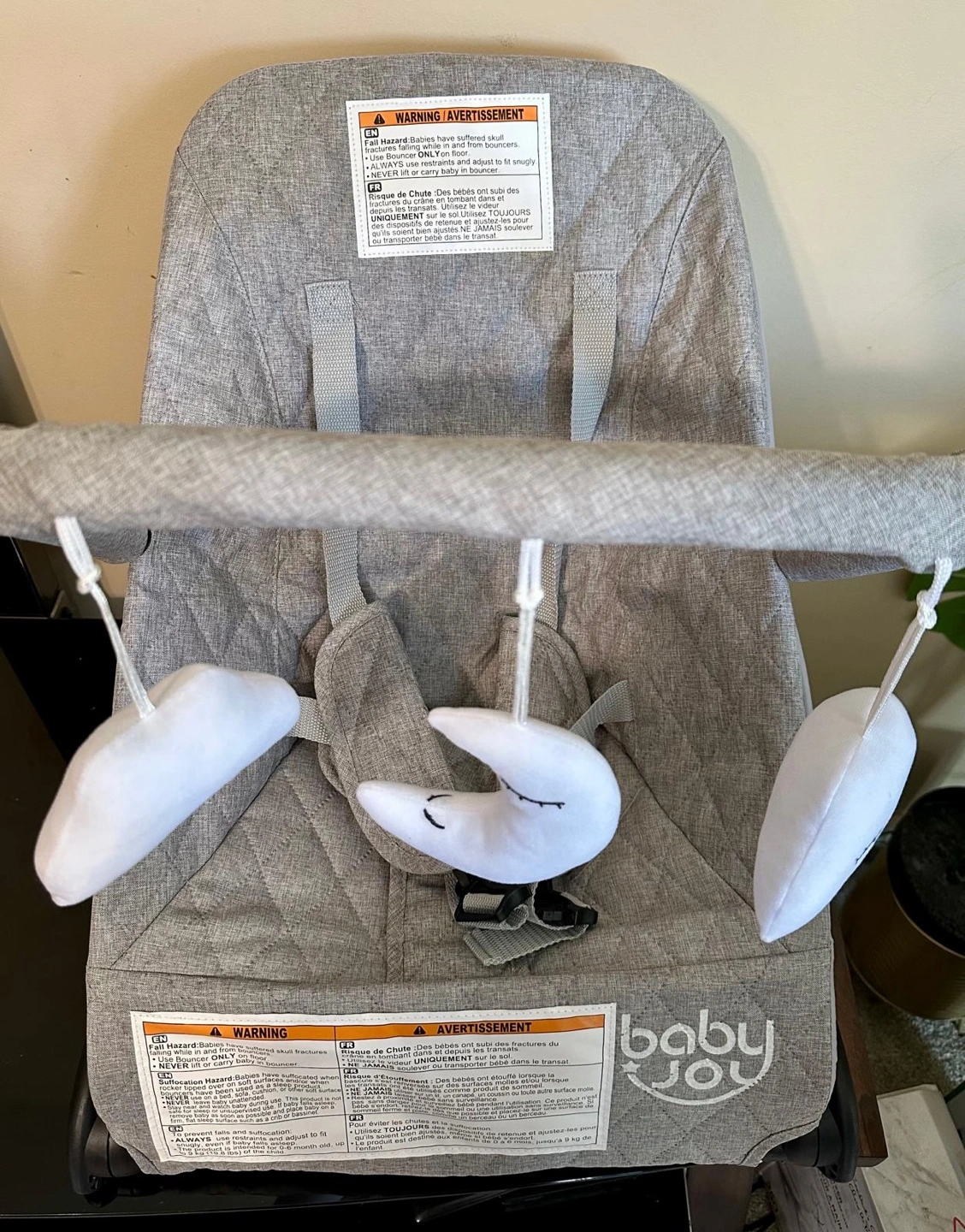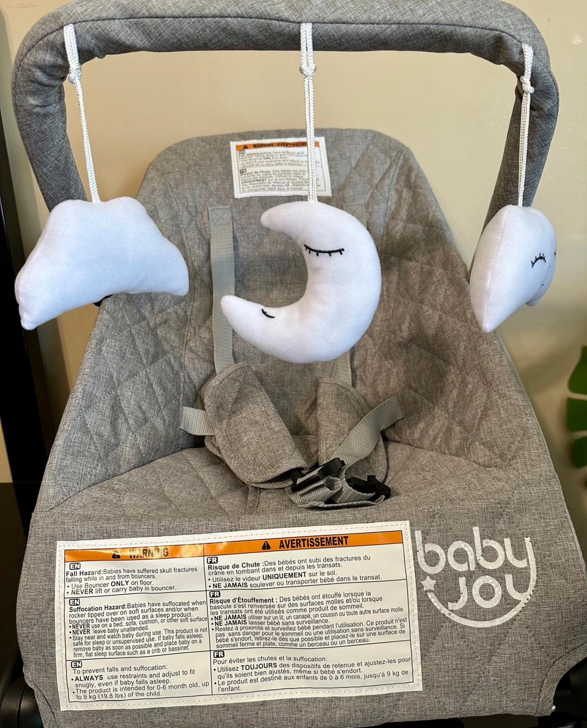 Grey fabric bouncer with overhead toy bar. Features three plush cloud and crescent moon toys. Suitable for infants 0-6 months. Lightweight and portable. Easy to fold.