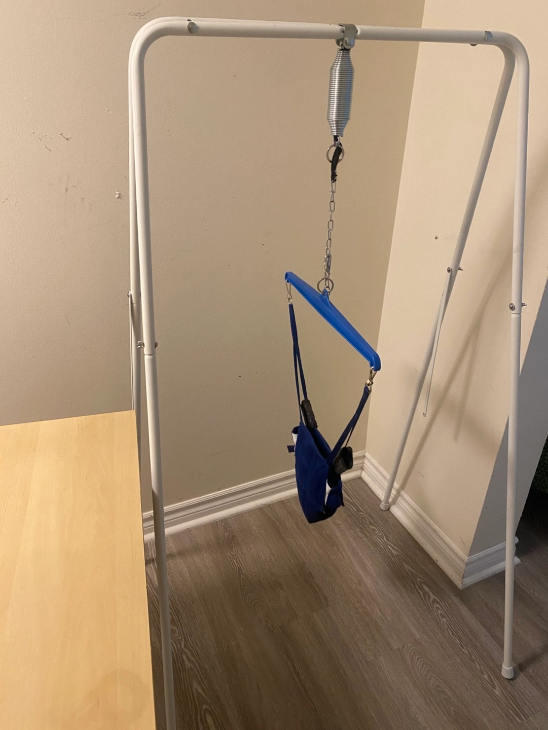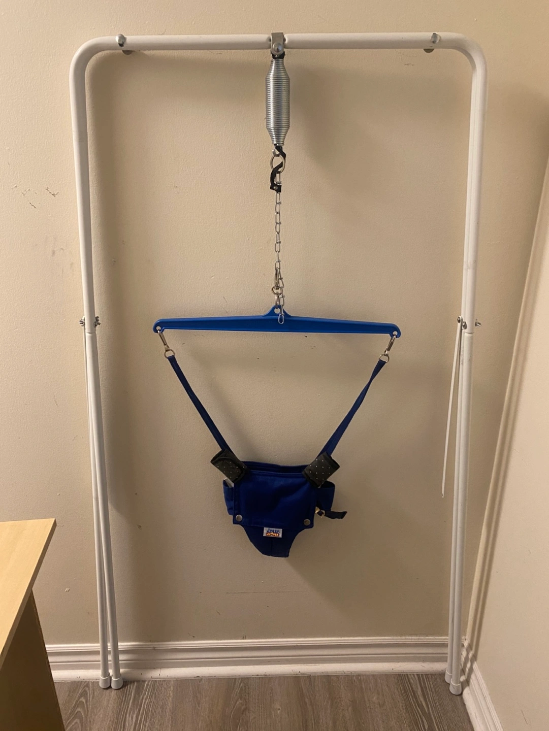 Baby jumper stand. White metal frame. Blue fabric baby seat. Spring mechanism. Good used condition.