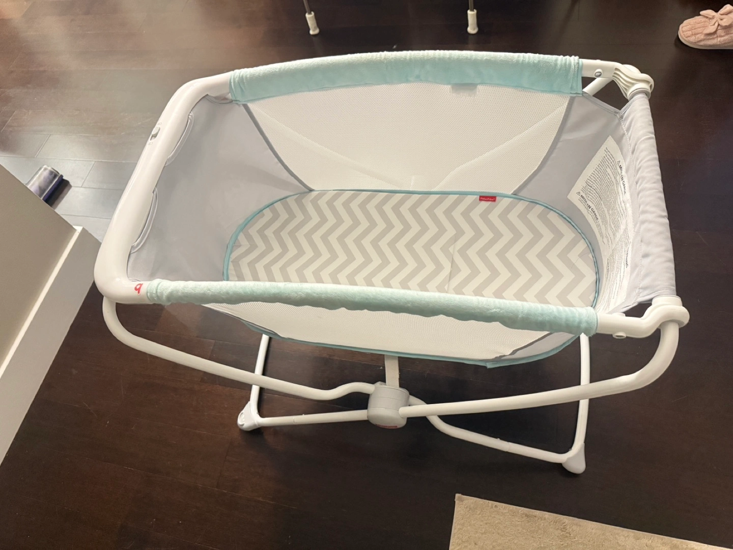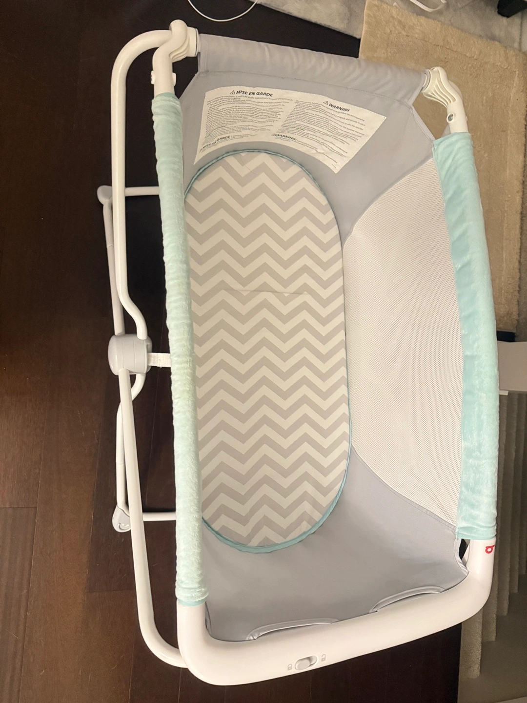 Baby playard/bassinet with a grey chevron mat. Great for travel or use at home.
