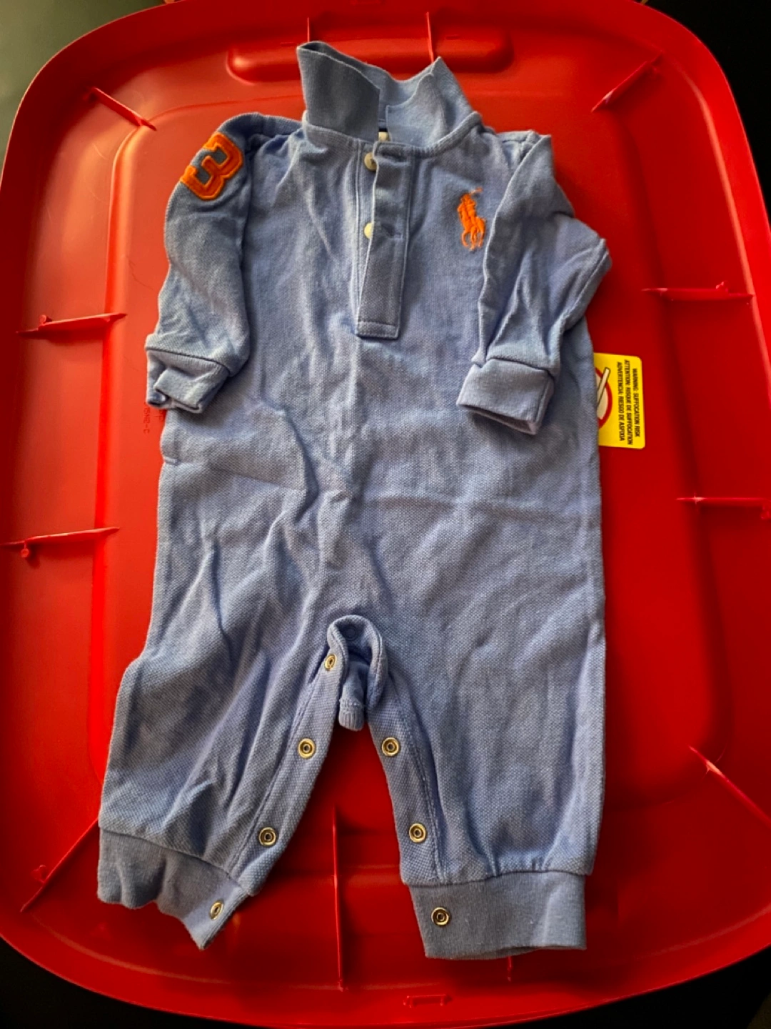 30Adorable baby romper. Periwinkle blue. Long sleeves. Snap closure. Embroidered pony logo. Number 3 on sleeve. No delivery No holds As is no refunds