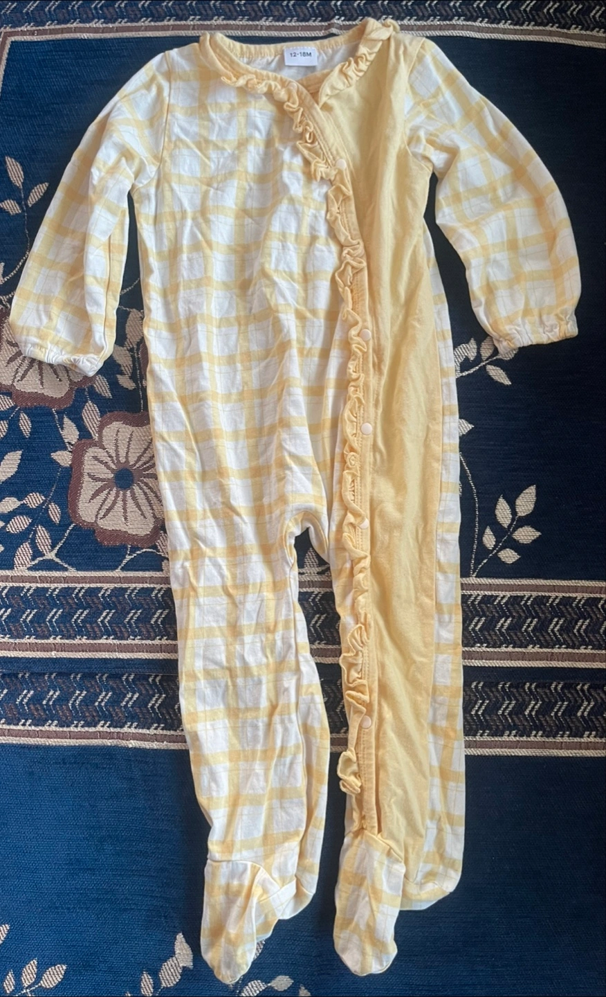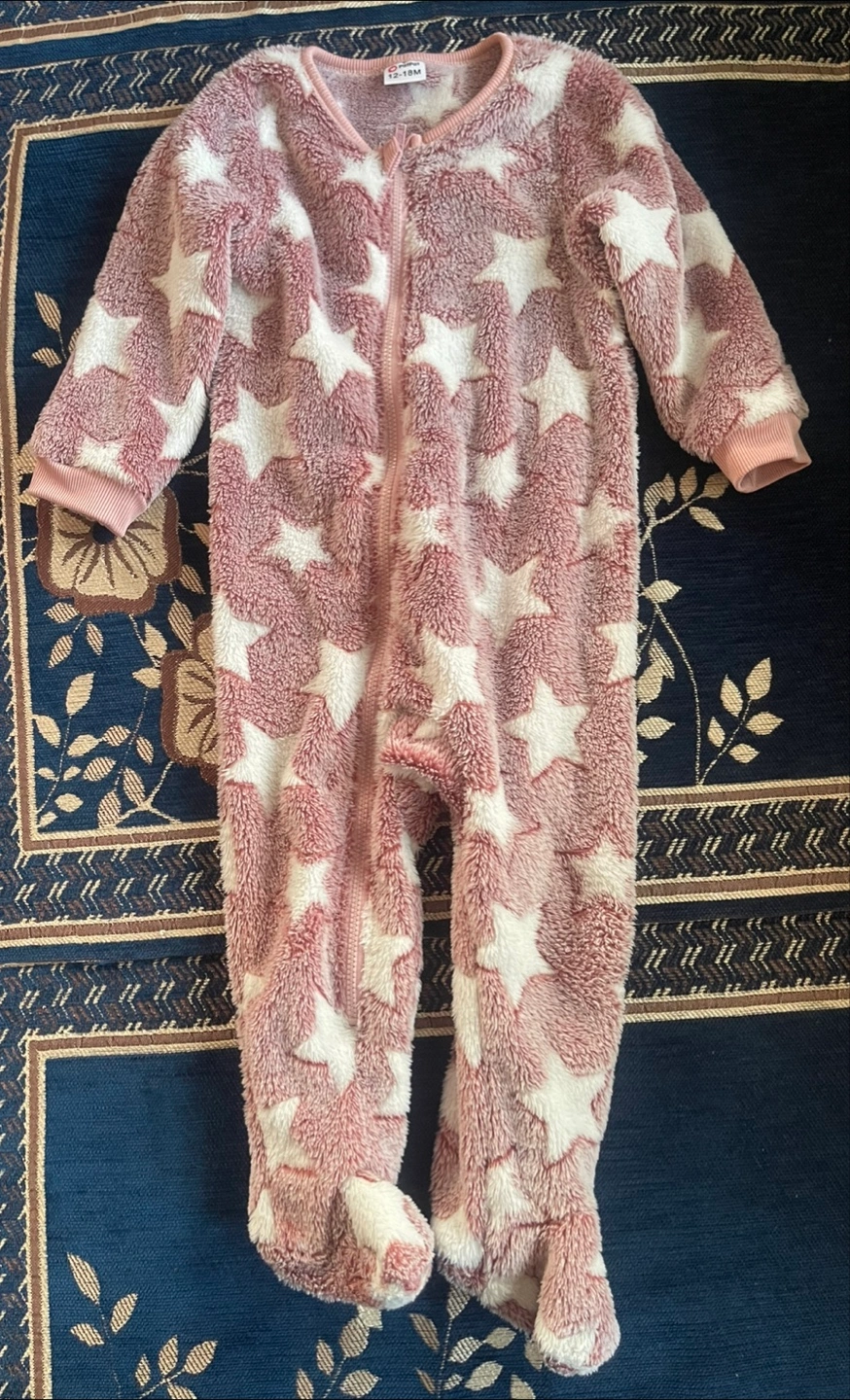 Two cute baby rompers for sale! One is a yellow and white checkered pattern with ruffle detailing(never used), and the other is a pink fuzzy romper with white stars. Both are size 12-18 months and in great condition!