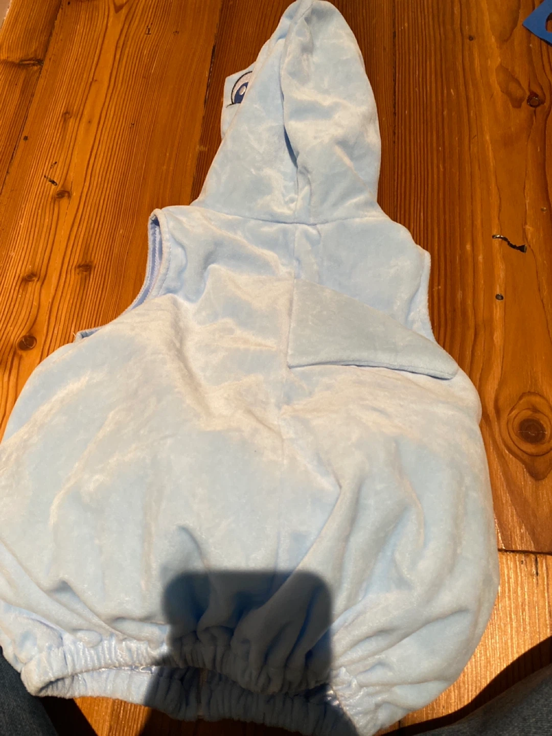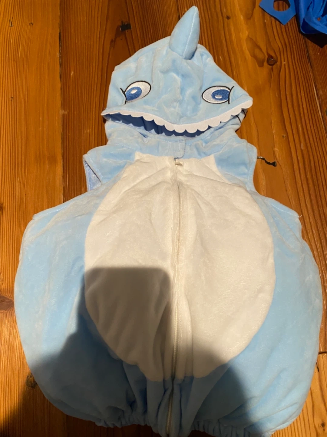 183Adorable baby shark costume! This costume is in great condition and perfect for Halloween or dress-up. It is light blue and white with a hood. It features a zipper on the front. Your little one will look so cute in this!