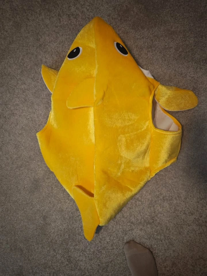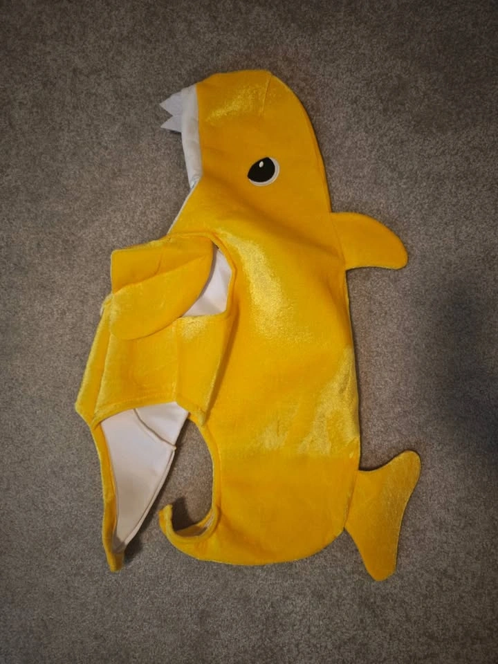 Adorable yellow Baby Shark costume, perfect for Halloween, school events, or dress-up play! Clean and gently used once. Soft, comfy, and super cute — guaranteed smiles all around! Fits roughly ages 2–4. Pick up in Richmond
