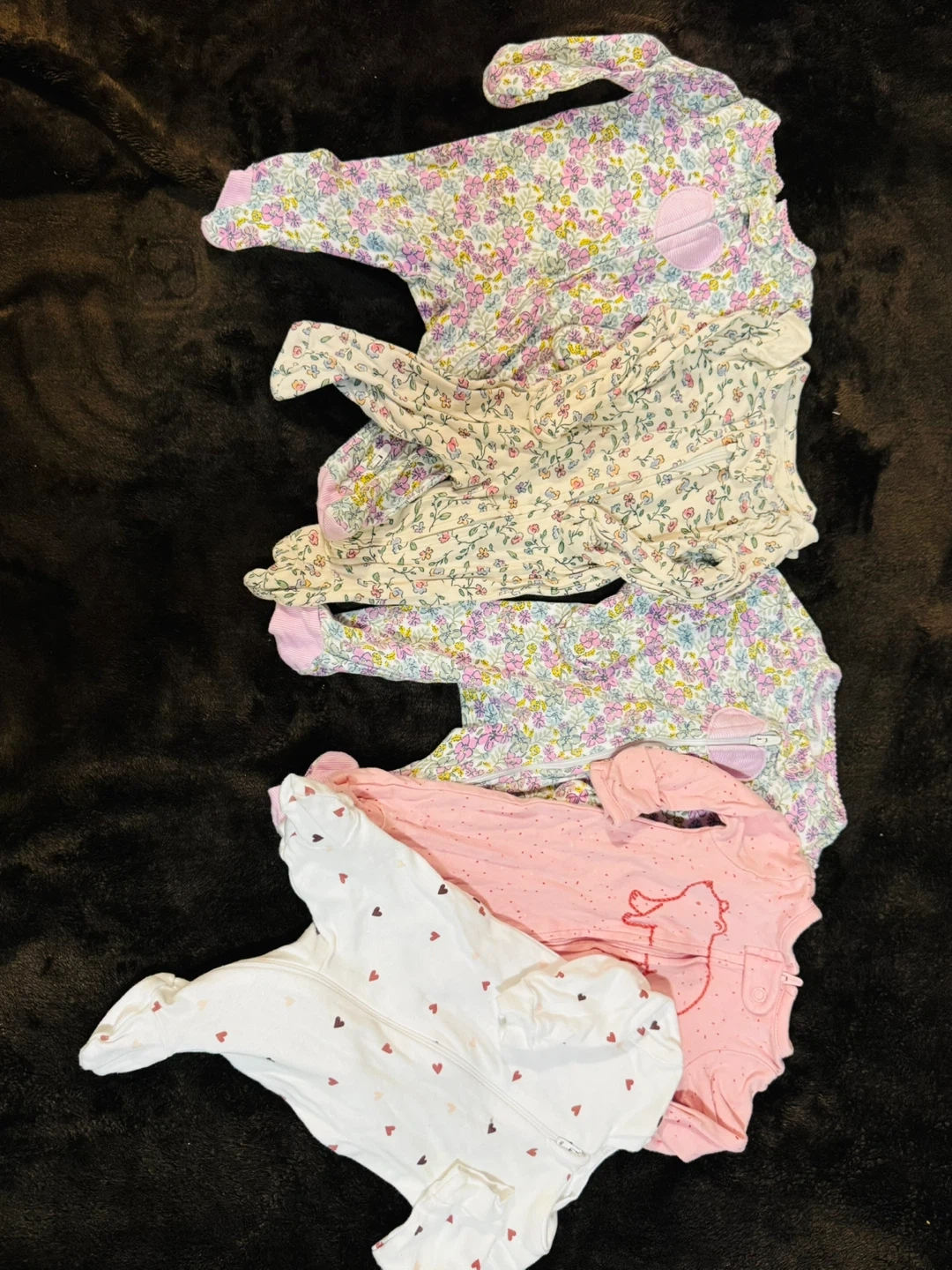 70A bundle of baby sleepers in various colours and patterns! They're in great condition and ready for a new home. Perfect for keeping your little one comfy and cozy during naptime or bedtime 4pc is carters brand and the white one is george