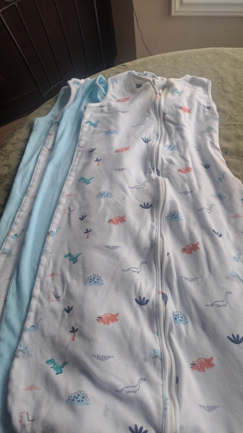 104 XL sleep sacks for baby. Two are blue and two printed (one has a stain on the top)