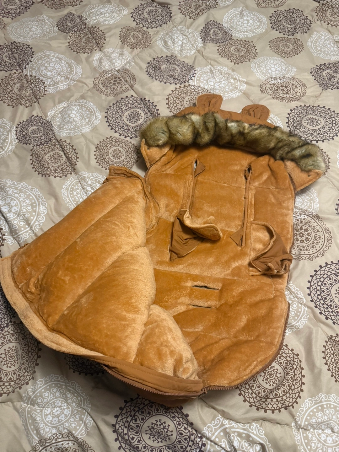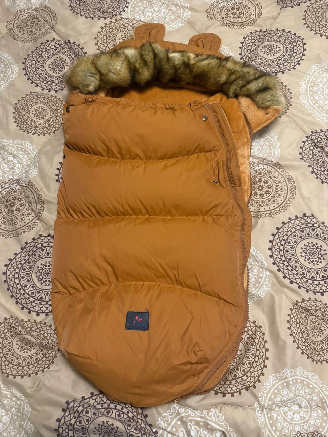 50Adorable brown stroller footmuff. Features a faux fur trim hood and zipper closure. Keeps baby warm and snug during cold weather. Suitable for various stroller models. Never used.