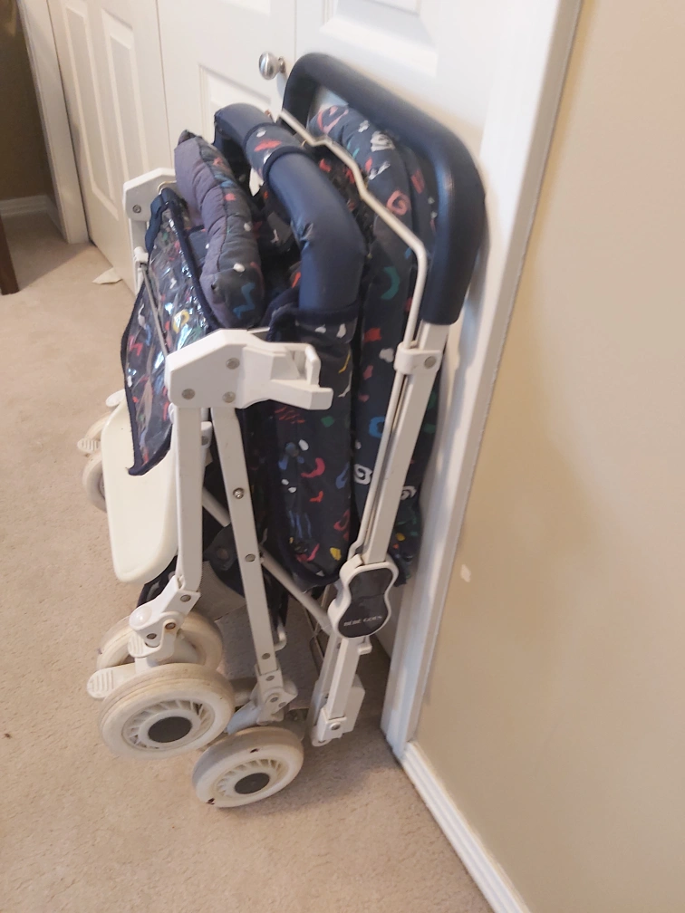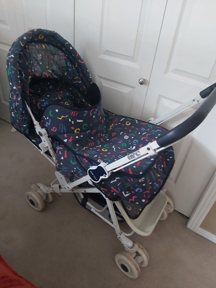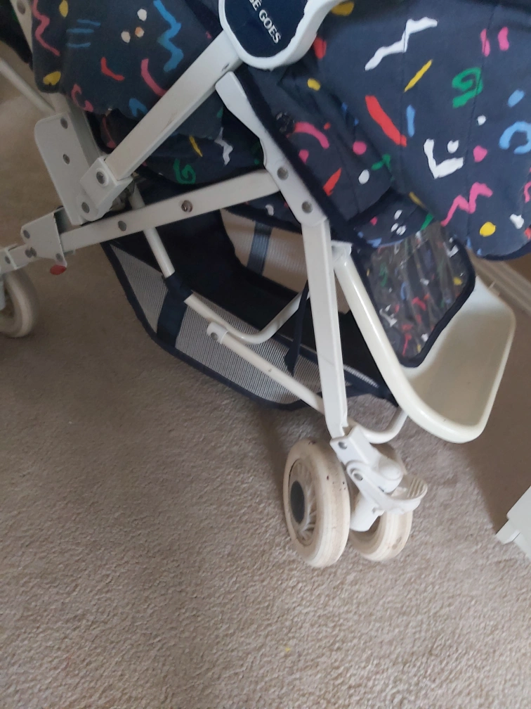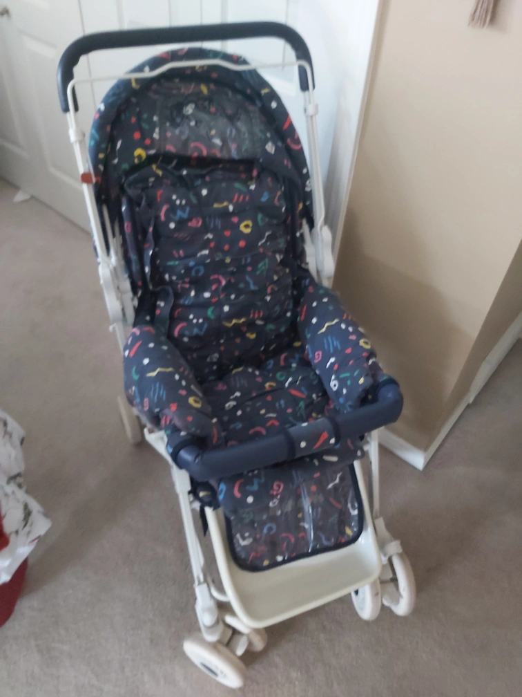 Stroller in good and very clean condition.All fabric has been removed and washed. Folds and all wheels lock and rotate. Comes with removable cover and cushion.
