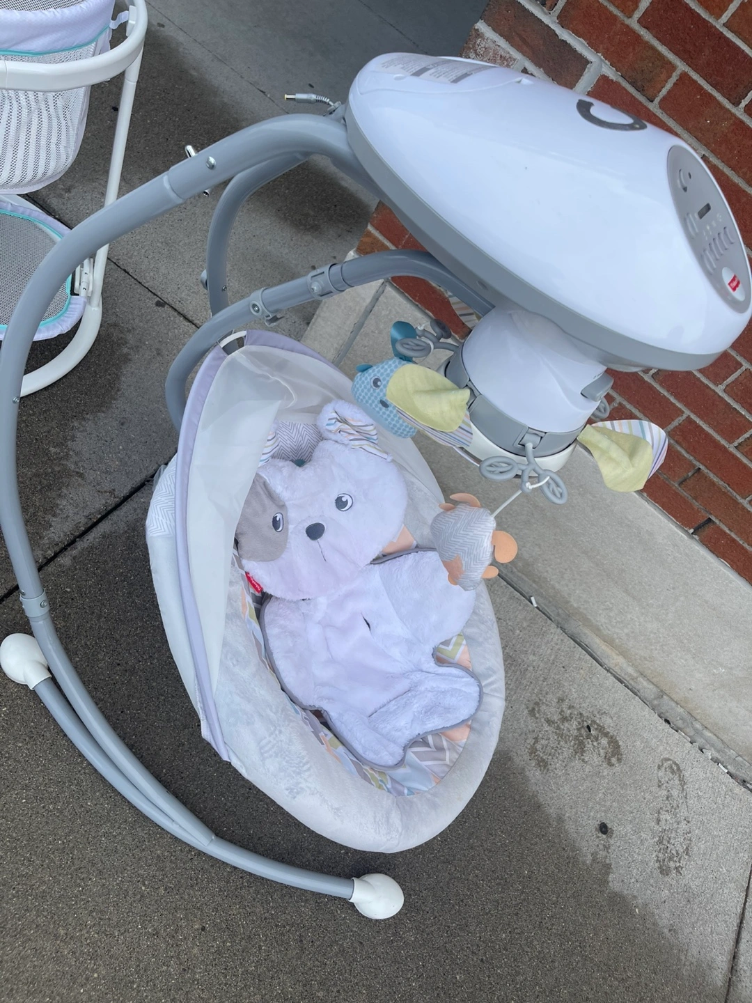 15A baby swing. Features a plush insert. Includes a mobile. An excellent way to keep a baby calm.