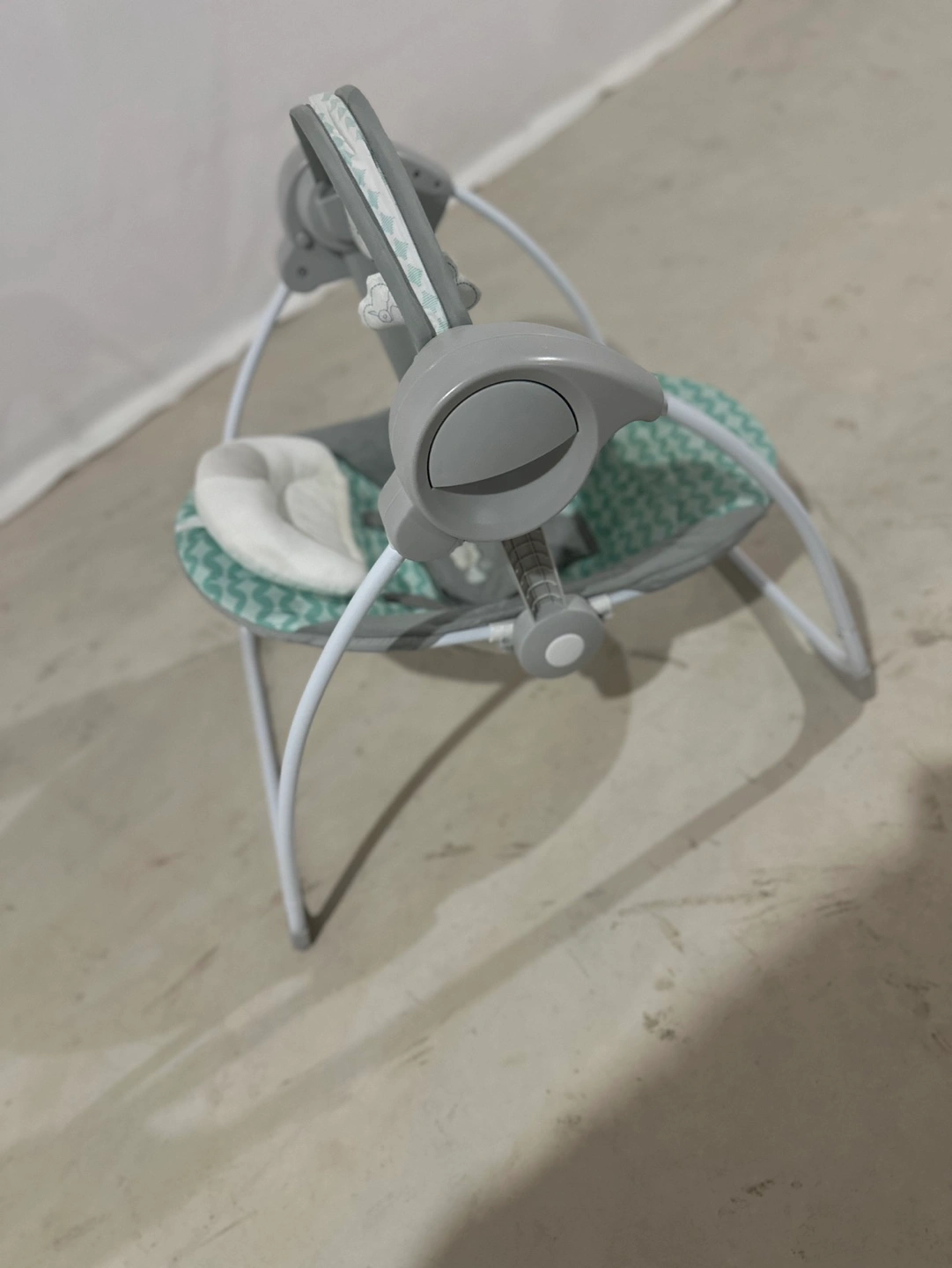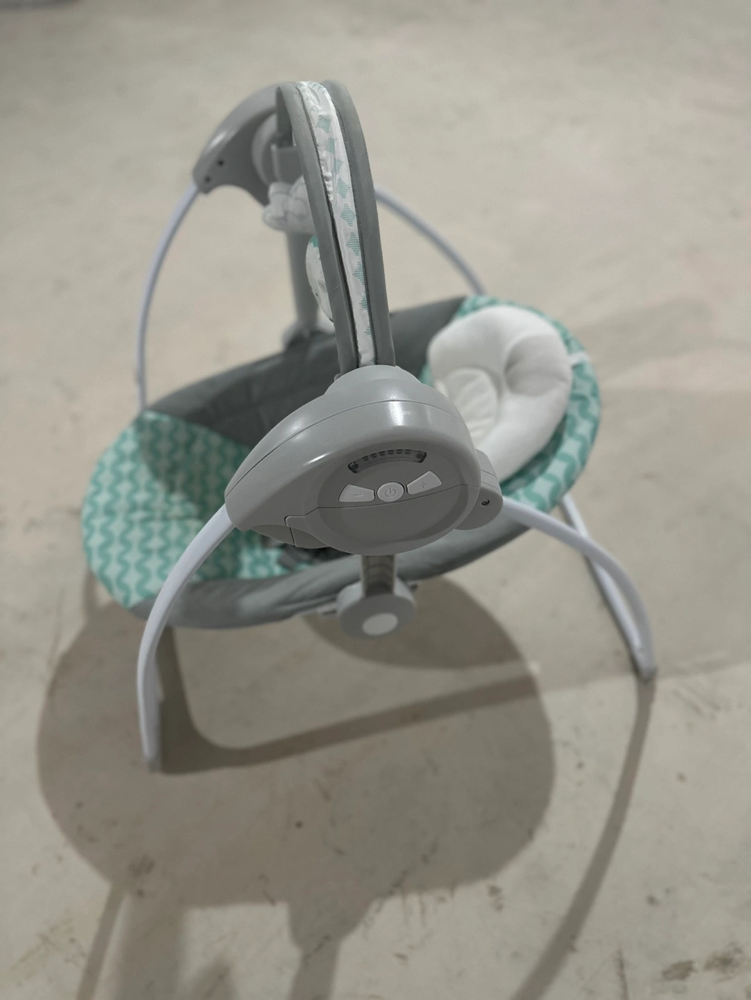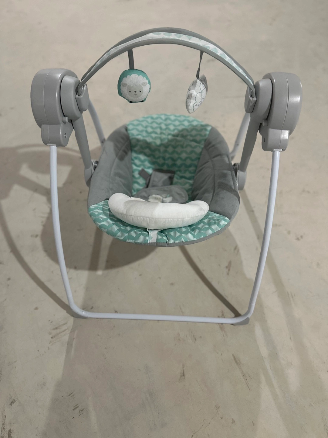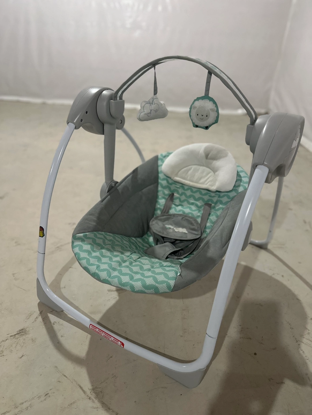 26Baby swing with multiple speeds and soothing sounds. Includes a removable toy bar.