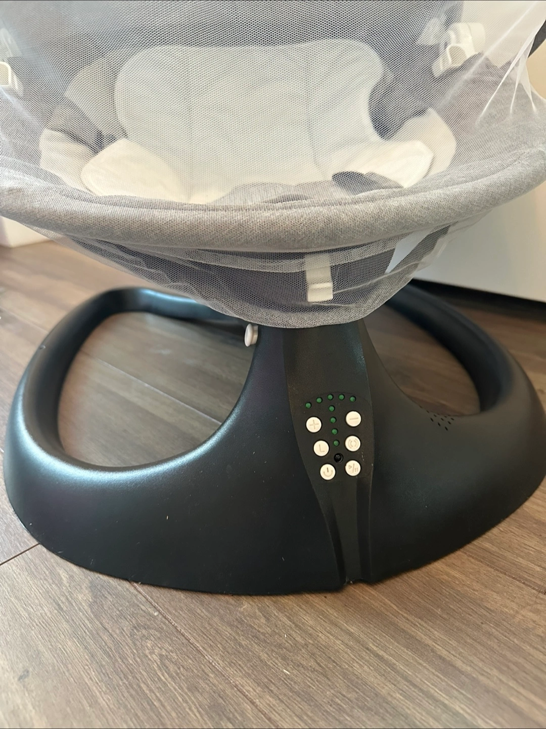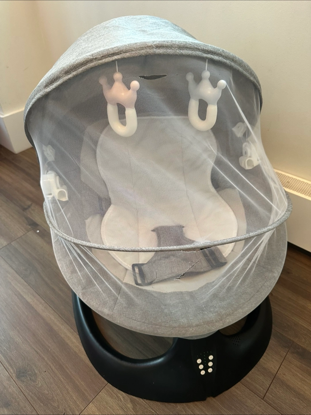 Selling a baby swing that comes with a remote control. It's in great condition and ready for a new home! It features a canopy with attached toys and a safety harness.