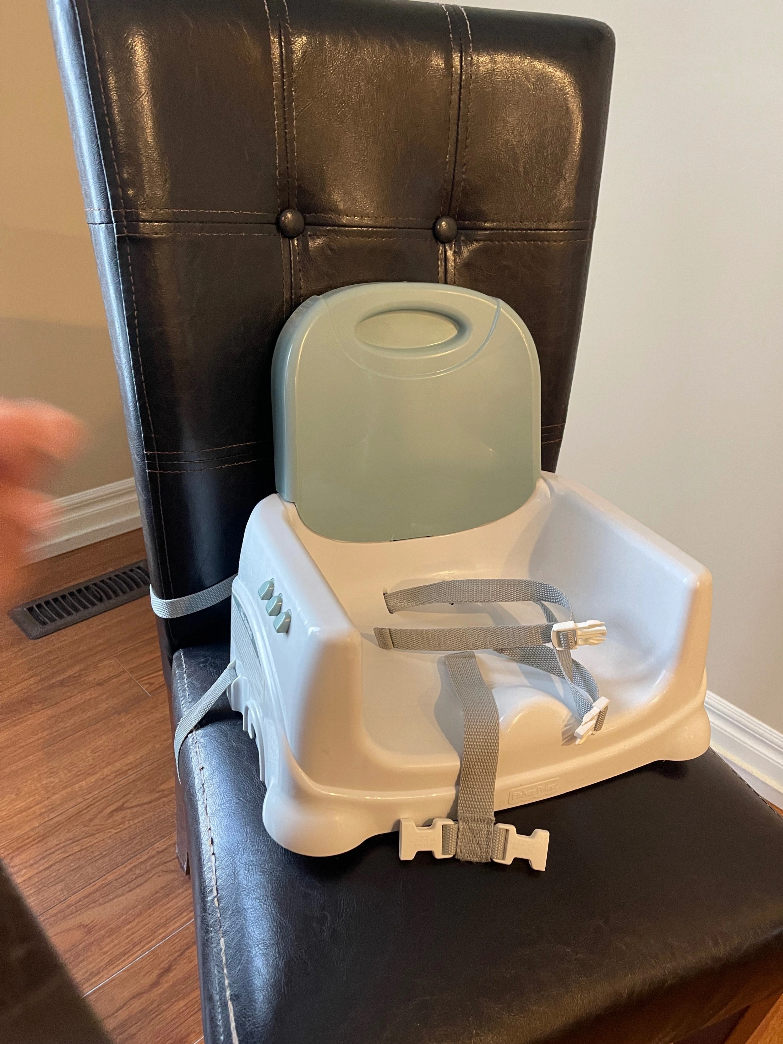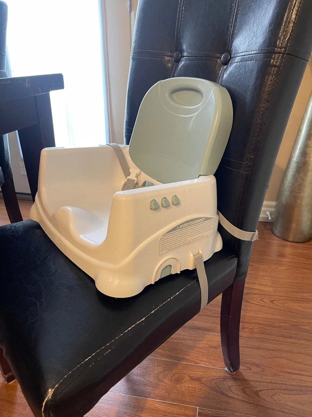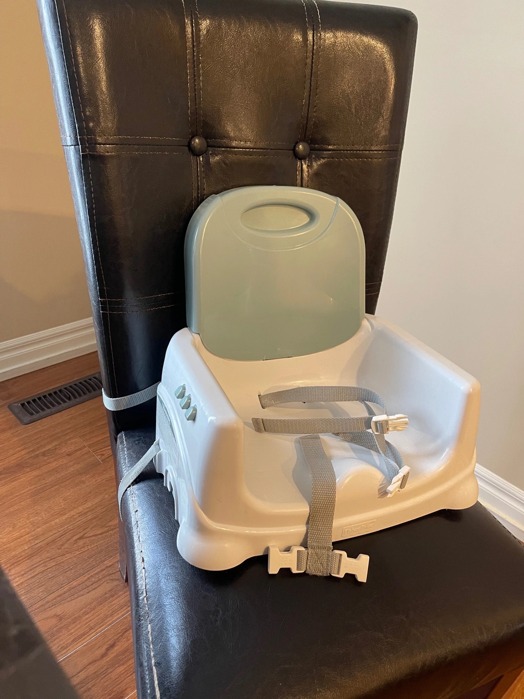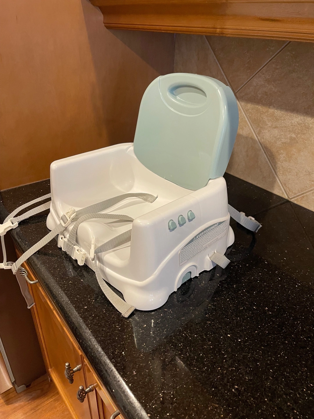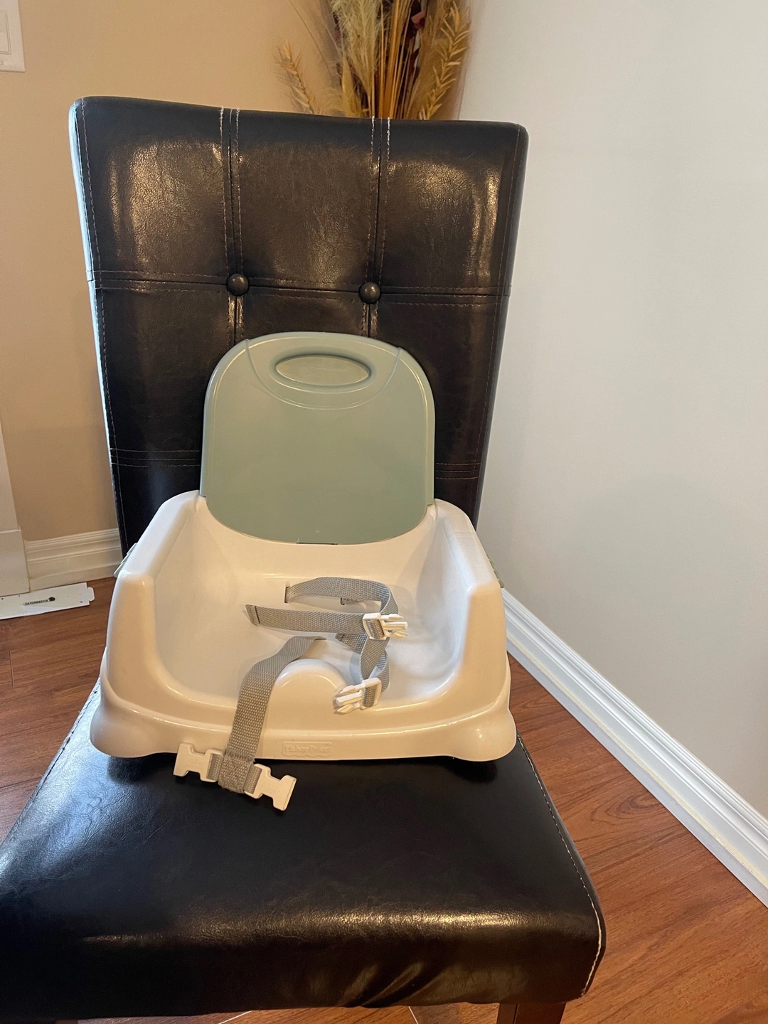 Moving Sale. Well kept and good condition. Back is removable. Safely straps into any type of chair. Cash only. Pick up only, no delivery. OBO but no low ball offers. Cash only. If this ad is up, this item is still available.