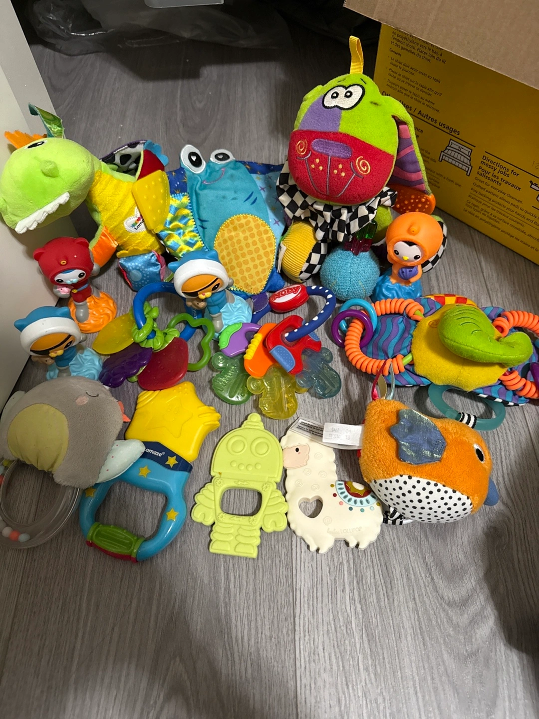 60Large collection of baby toys. Includes soft toys, teethers, and rattles. Many different colours and textures. Price is firm. Selling as a bundle only.