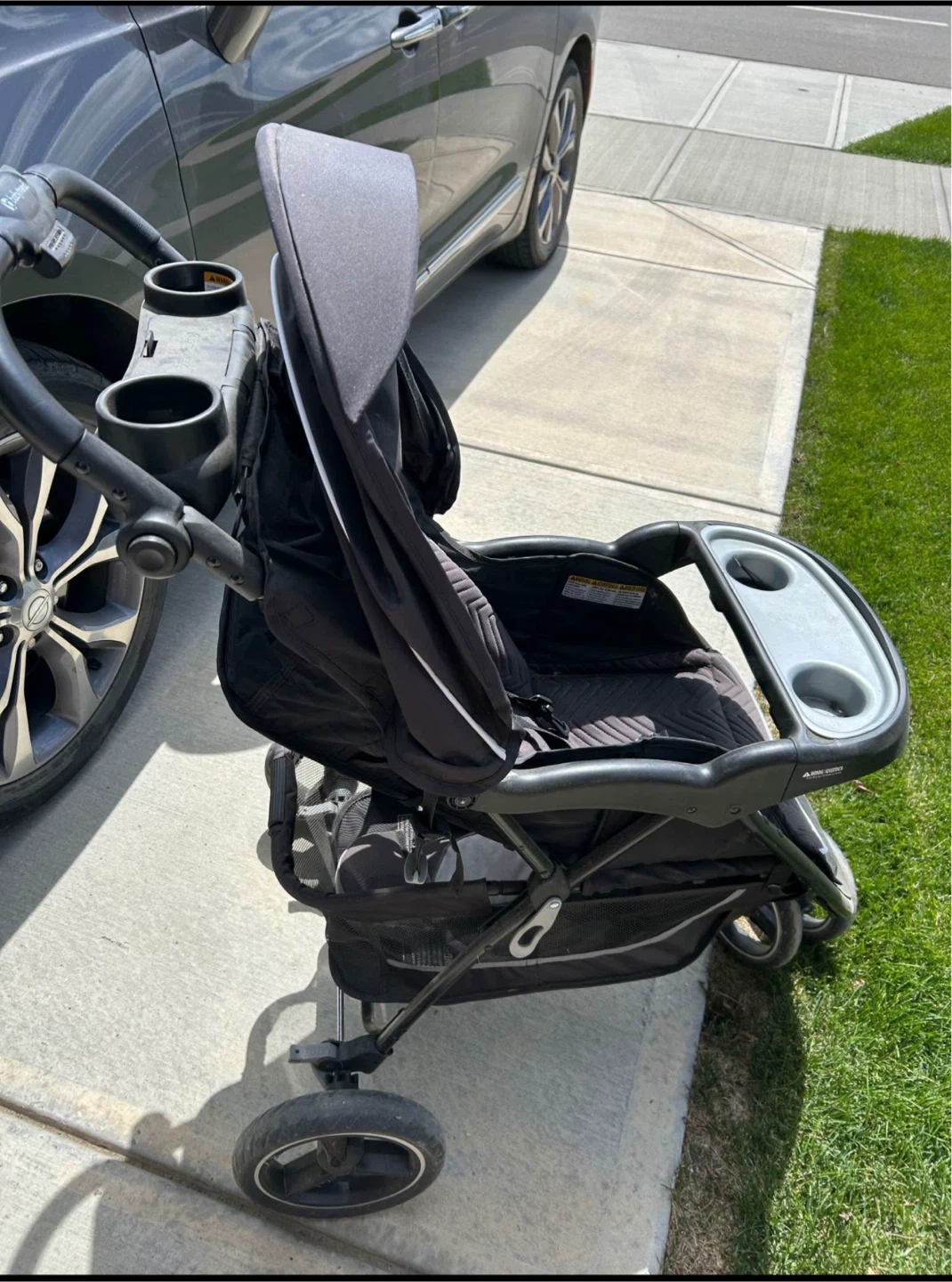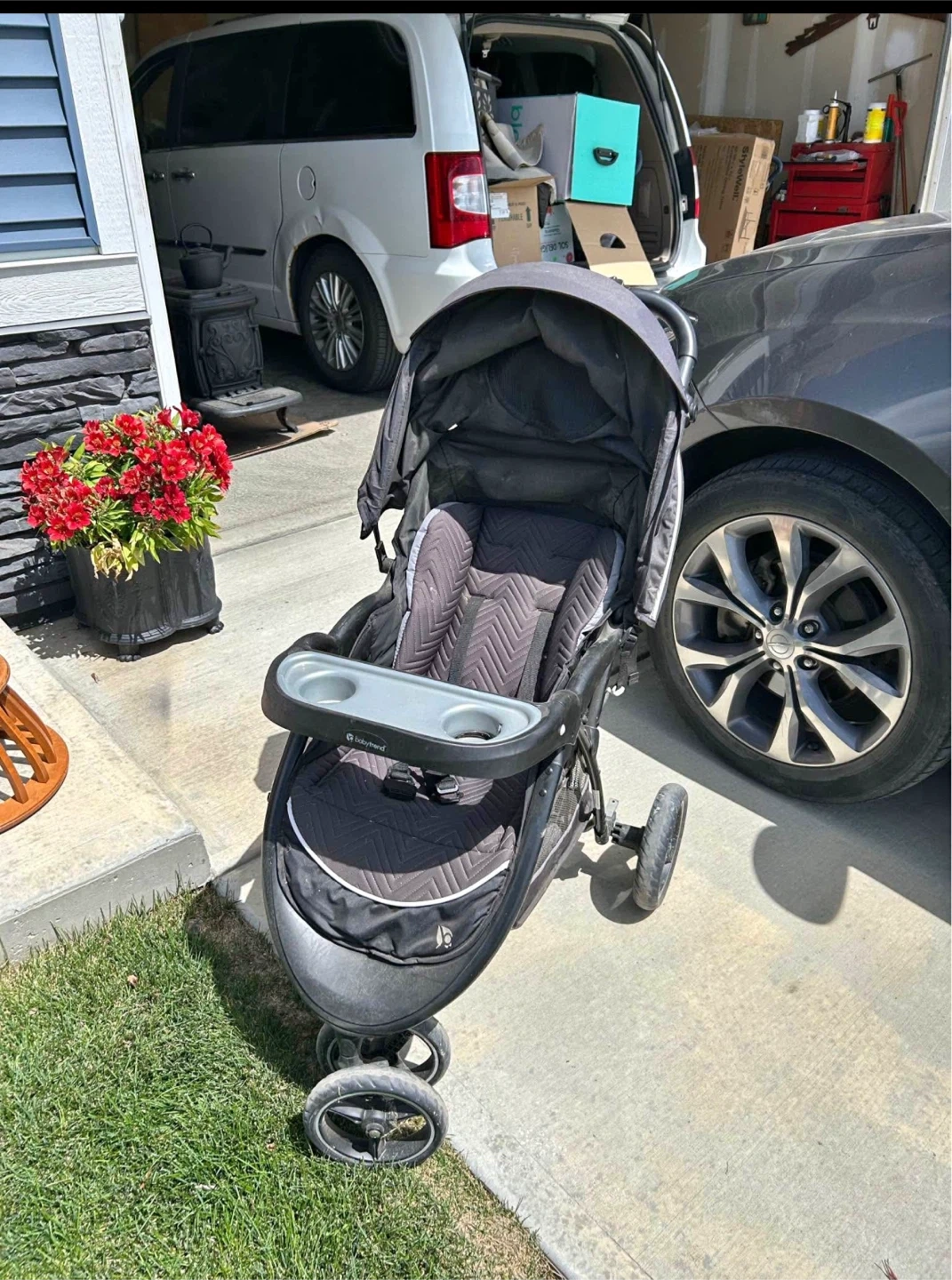 Selling a Baby Trend stroller in black. It's in good condition and ready for a new family. Perfect for walks around the neighbourhood or trips to the park! It features a convenient tray for drinks and snacks for your little one.