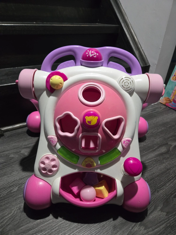 Baby walker in pink and white with purple handle. It has a shape sorter and other interactive features to keep your little one entertained. Perfect for helping your baby learn to walk!