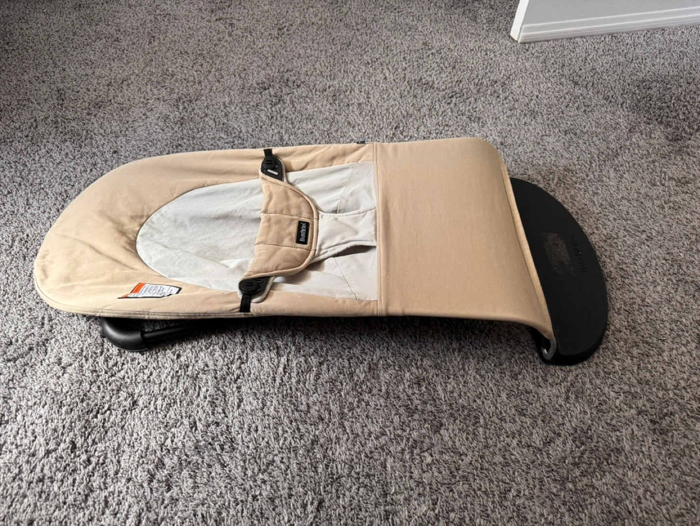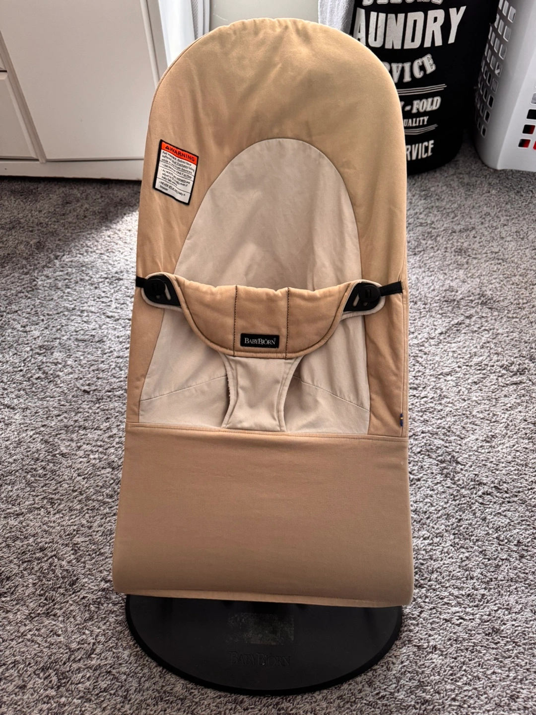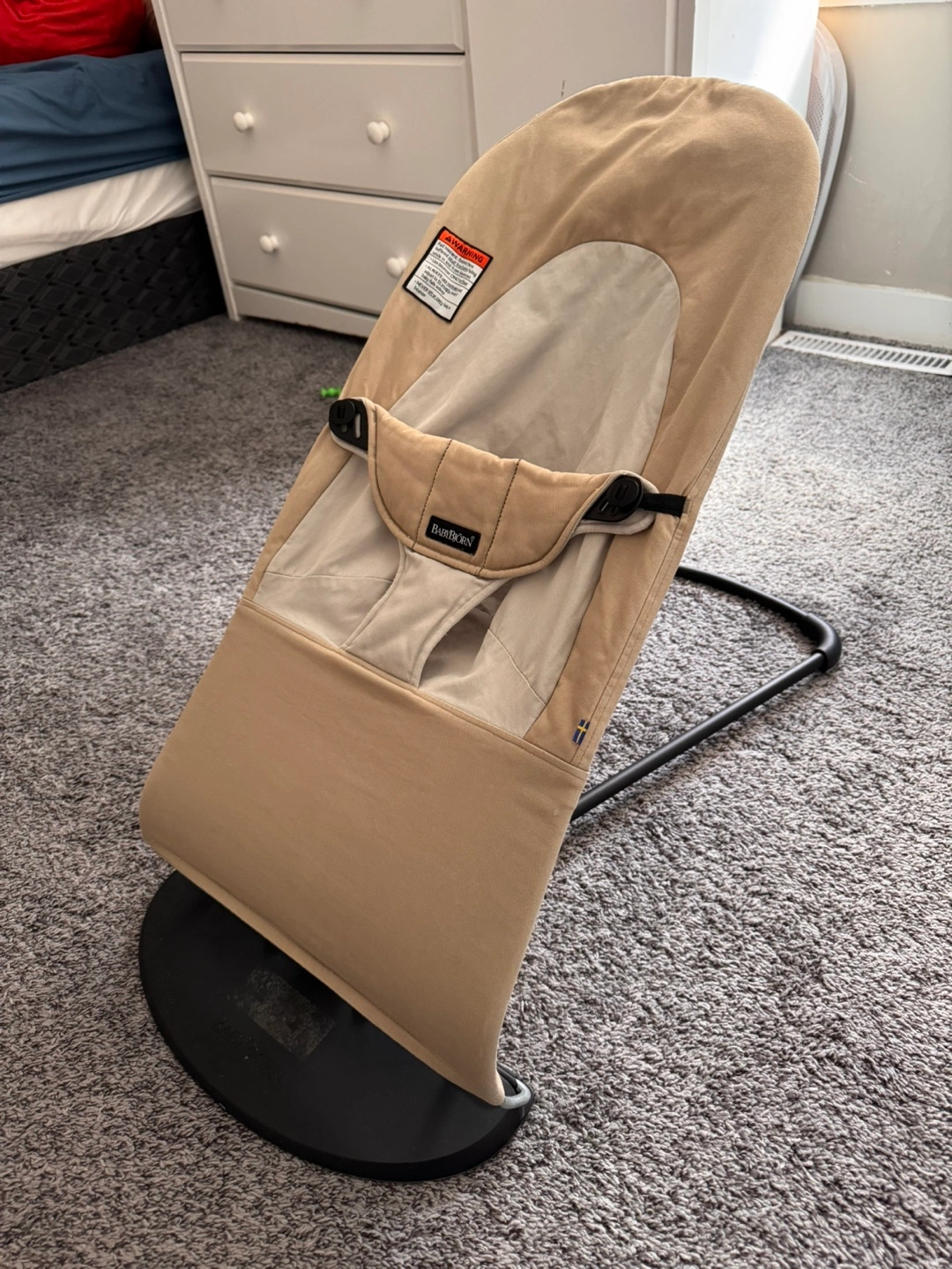 103Used BabyBjorn Bliss baby bouncer. Beige fabric. Includes original box. Gently used, excellent condition.