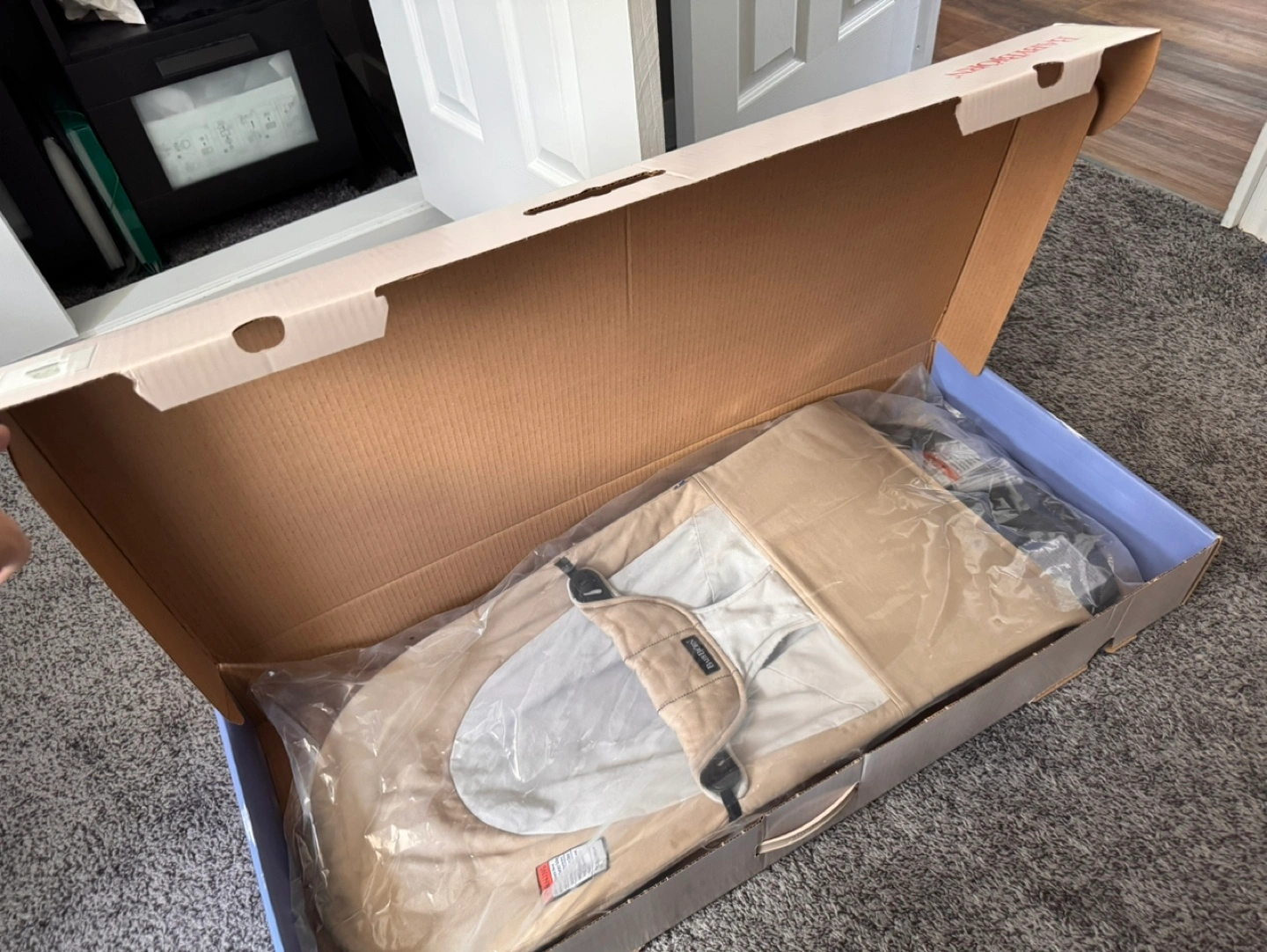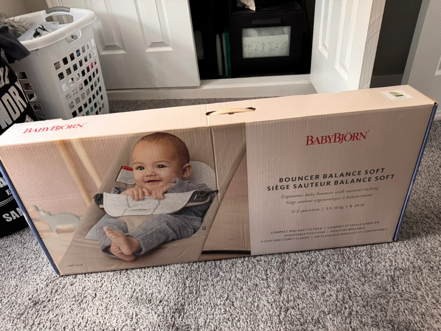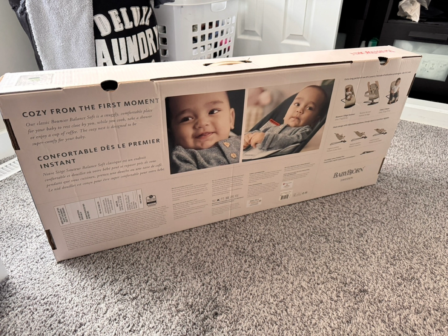103Used BabyBjorn Bliss baby bouncer. Beige fabric. Includes original box. Gently used, excellent condition.